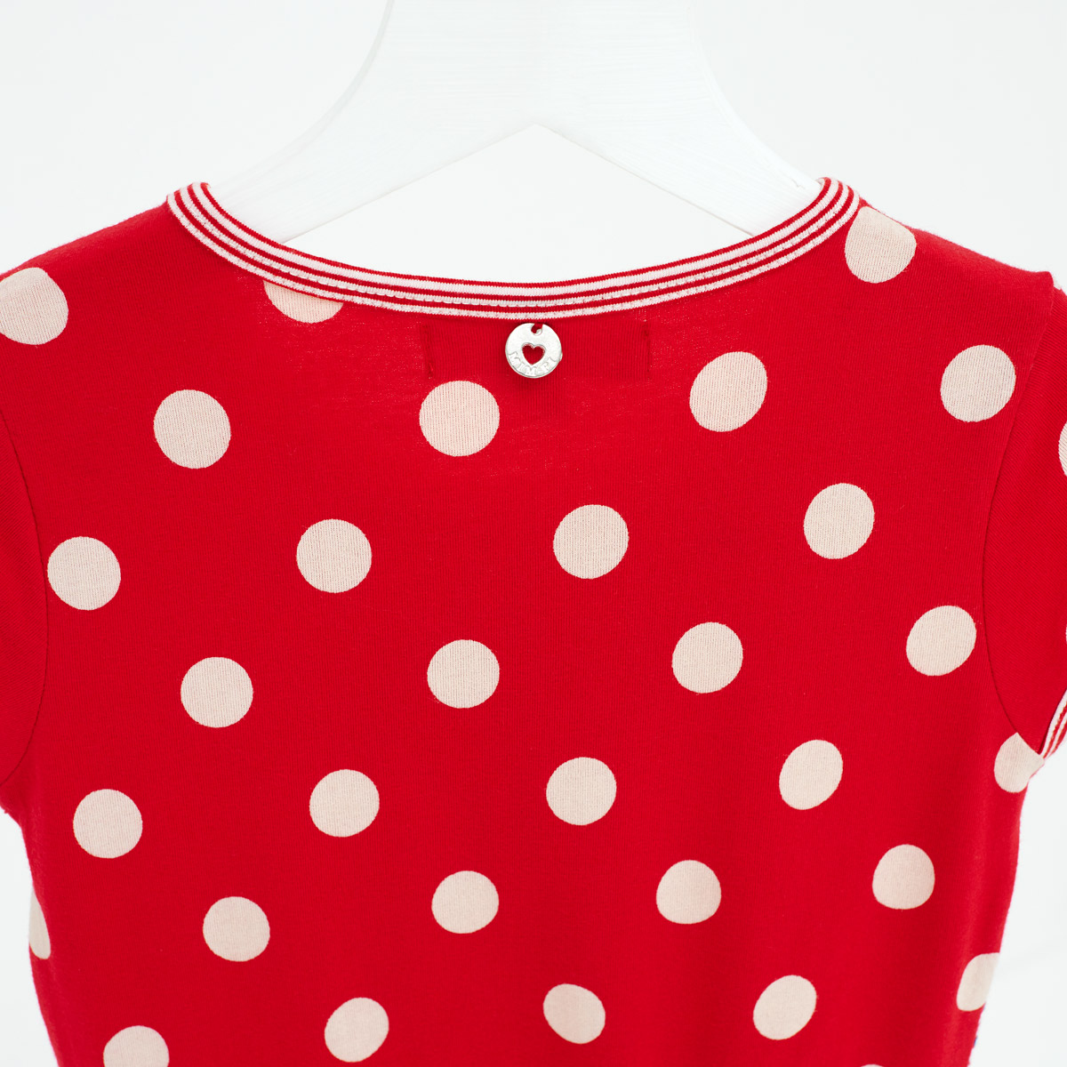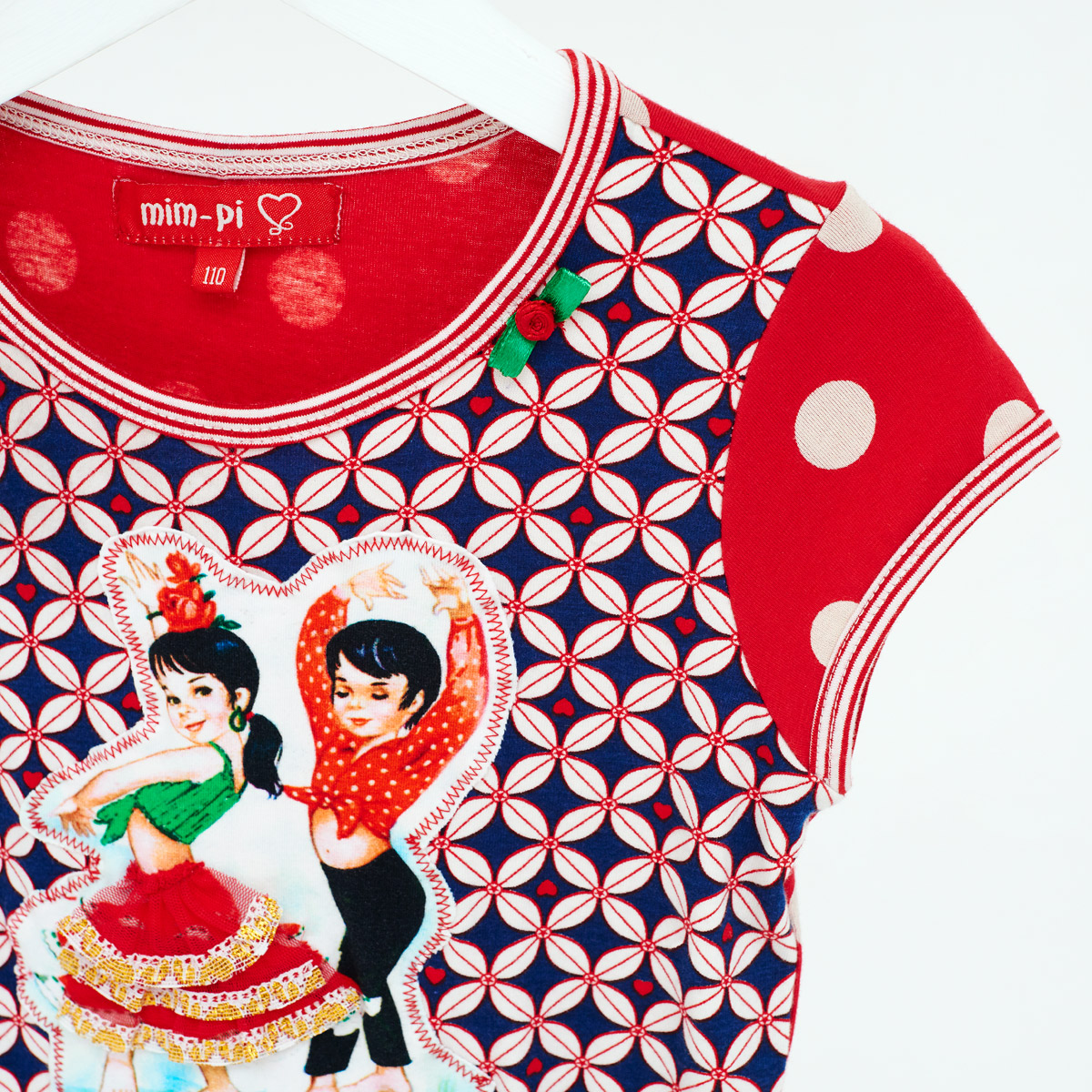 Blau-weiß-rotes Sommer-Kleid in elastischer Qualität, mit einem Druckmuster aus Sternen und Herzen. Auf der Vorderseite ziert ein Bild einer Retro-Postkarte aus Spanien, auf dem der Rock der Tänzerin mit Spitze verziert ist. Die Ärmel und der Rücken sind rot-weiß gepunktet. Der Halsausschnitt und der Saum sind mit einer rot-weiß geringelten Zierborte eingefasst. Den Ausschnitt ziert eine kleine Rose und eine Mim-Pi-Logo-Münze.