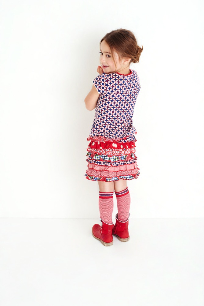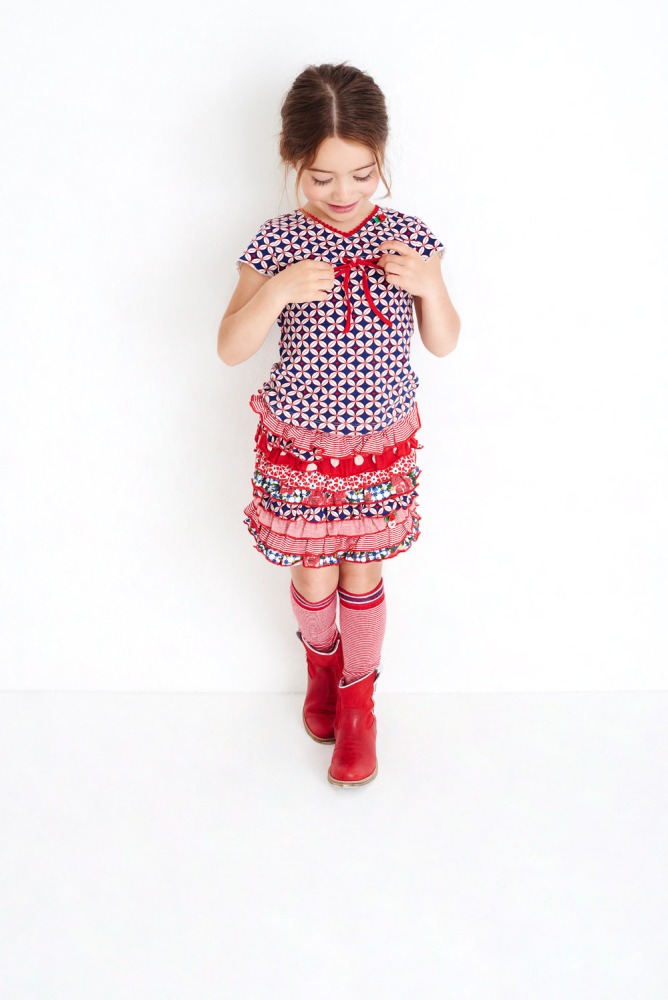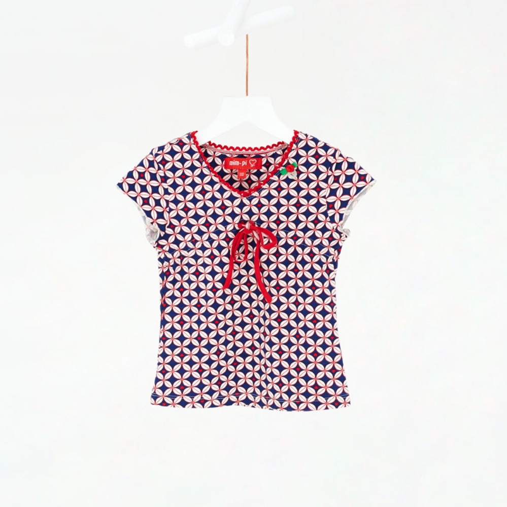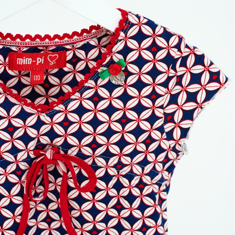 Blau-weiß-rotes T-Shirt von Mim-Pi mit V-Ausschnitt, Zugband unter der Brust, das Druckmuster besteht aus Sternen und Herzen, den Ausschnitt ziert eine kleine Rose und Mäusezähnchenspitze.