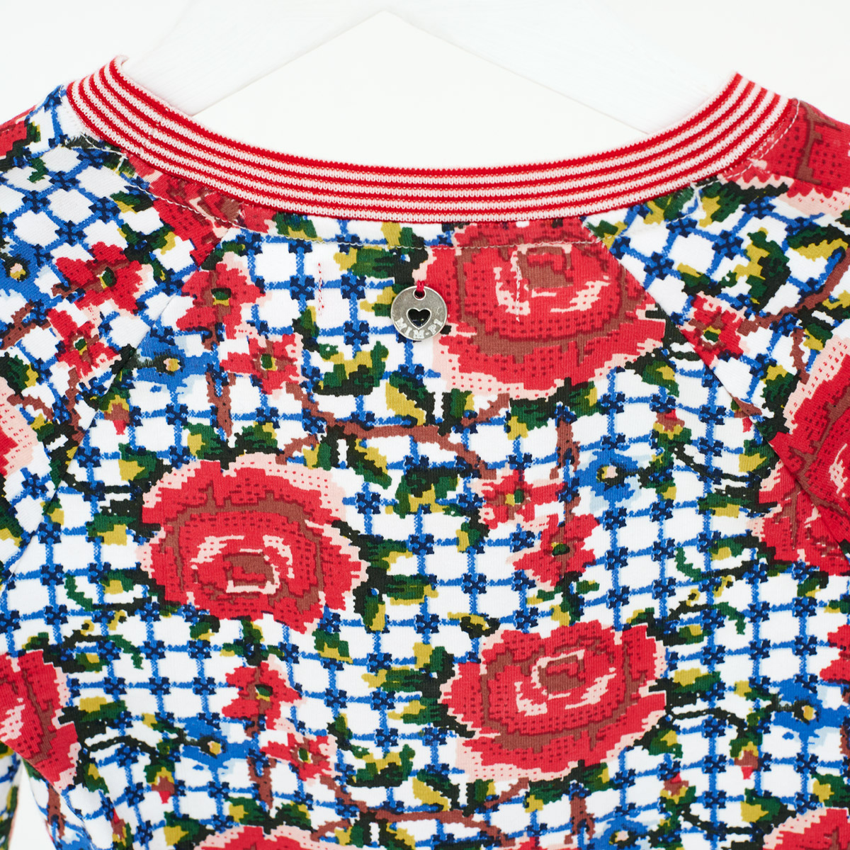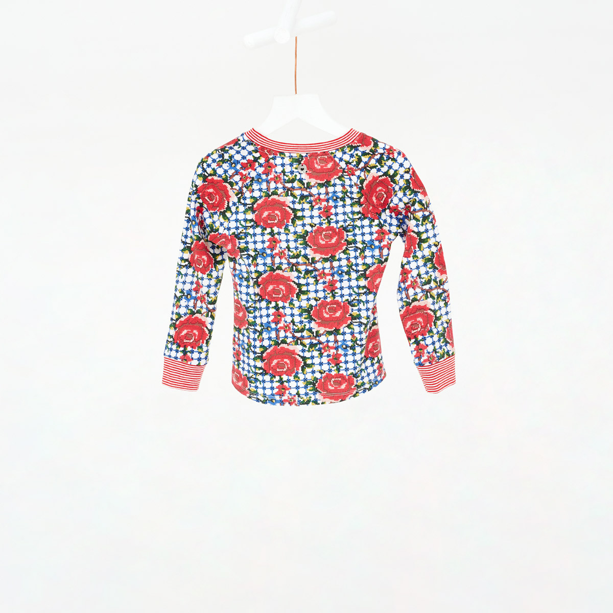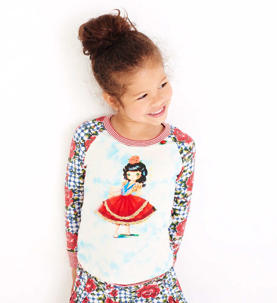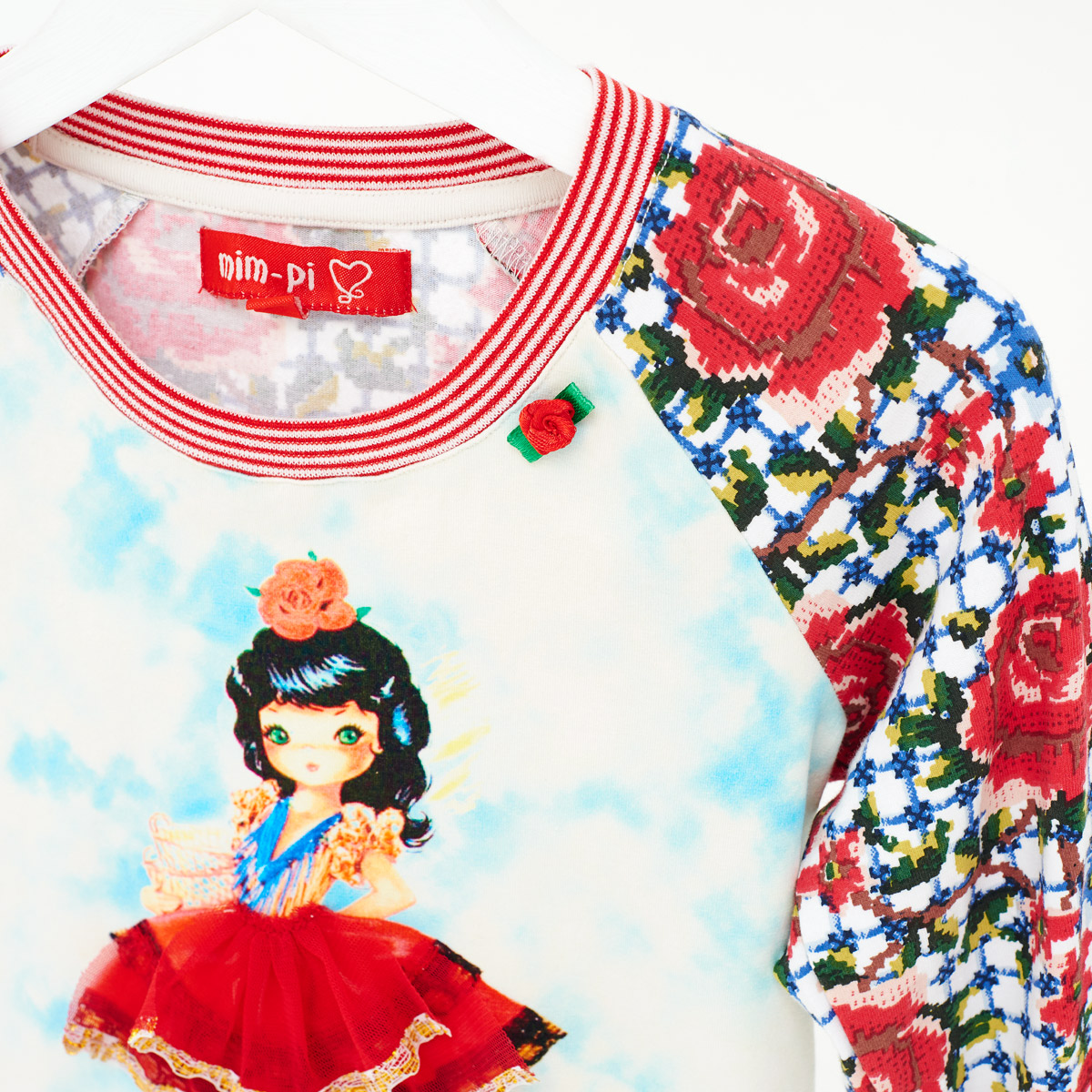 Langarmshirt im Spanish-Rose-Print. Die Vorderseite ziert eine spanische Tänzerin mit einer Rose im Haar von einer Retro-Postkarte aus Spanien - der Rock der Tänzerin ist aus echtem Tüllstoff mit Goldrand. Den Ausschnitt ziert eine Rose und eine Mim-Pi-Logo-Münze.
