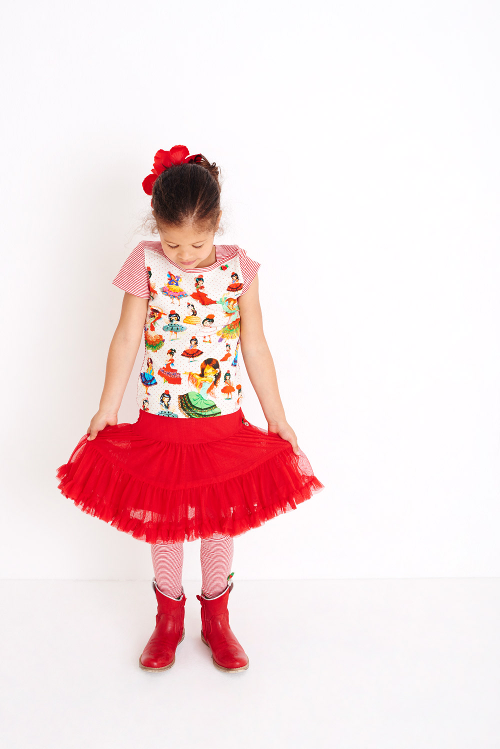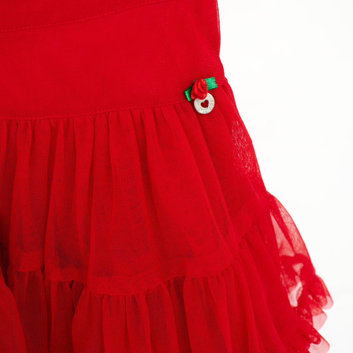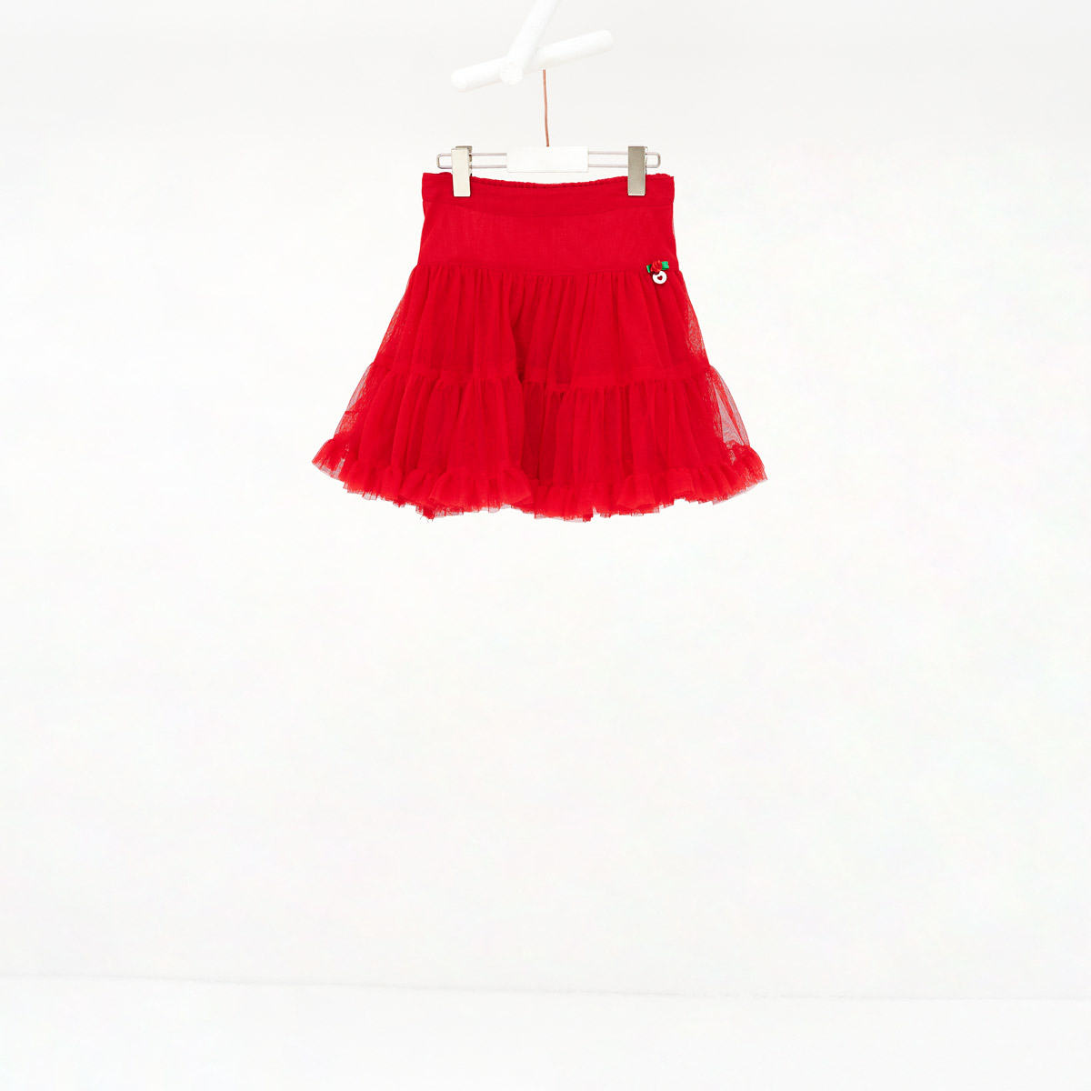 Für unsere Prinzessinnen: Weitschwingender, mehrlagiger, roter Tüllrock in einer superweichen Qualität. Teilgummizug im Bund, Unterfüttert mit einem Rock aus 100% Baumwolle. Diesen Rock schmückt eine kleine Rose und die Mim-Pi-Logo-Münze.