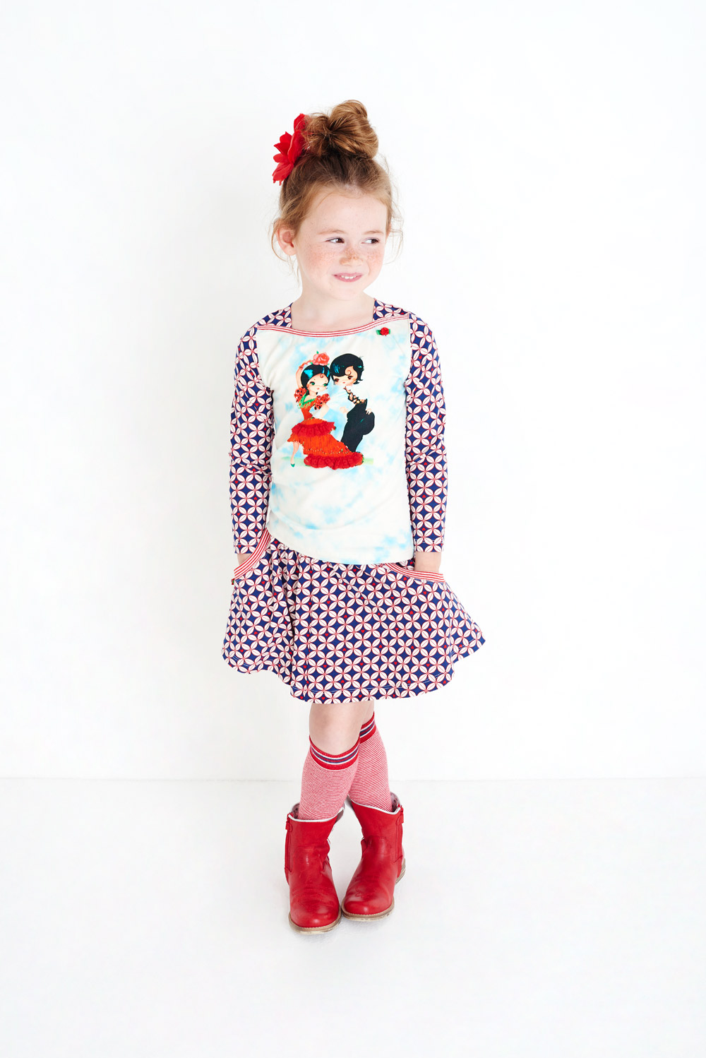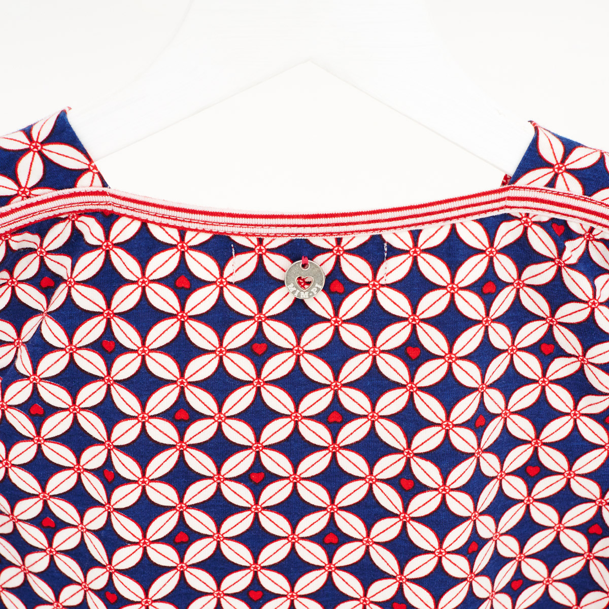 Blau-weiß-rotes Langarmshirt mit UBoot-Ausschnitt - liegt sehr schön am Hals an. Das Druckmuster besteht aus Sternen und Herzen und die Vorderseite ziert ein Bild einer Retro-Postkarte aus Spanien - der der Rock der Tänzerin ist mit Spitze verziert. Den Ausschnitt ziert eine kleine Rose und eine Mim-Pi-Logo-Münze.