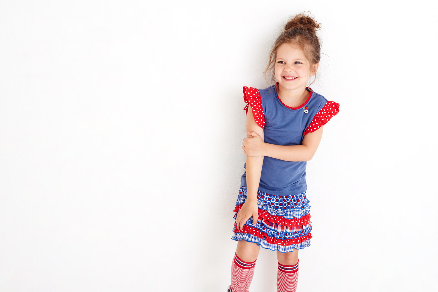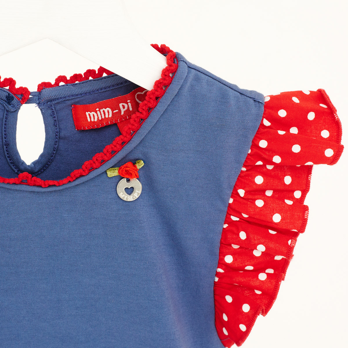 Blaues T-Shirt aus elastischem Baumwolljersey, witzige Rüschenärmel rot-weiß gepunktet. Der Halsausschnitt ist verziert mit Mäusezänchenspitze und mit einer kleinen Rose und Mim-Pi-Logo-Münze.
