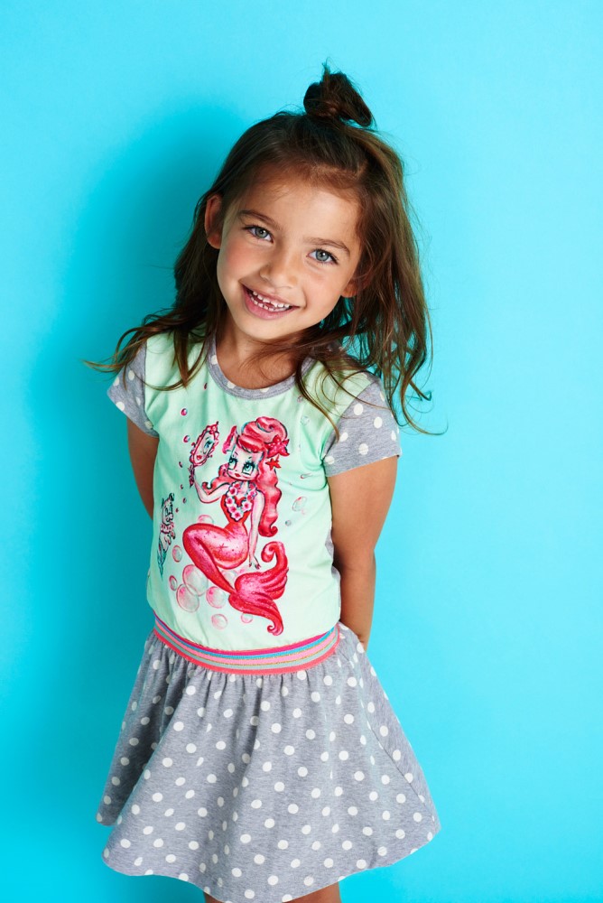 Traumschönes Kleid von Mim-Pi. Das Oberteil hat auf der Front ein traumhaftes "Meerjungfrau mit Hund"-Print und ist ansonsten mit Punkten allover. Der Rockteil ist weitschwingend, die Taille ziert ein bunt gestreifter Elastikbund.