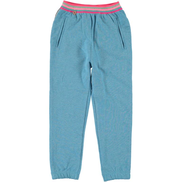 Bequeme Sweat-Hose von Mim-Pi in blue mit seitlicher silberner glitzernder Borte, zwei Eingrifftaschen, leichter Gummizugbund an den Beinen und mit gestreiftem Elastikbund.