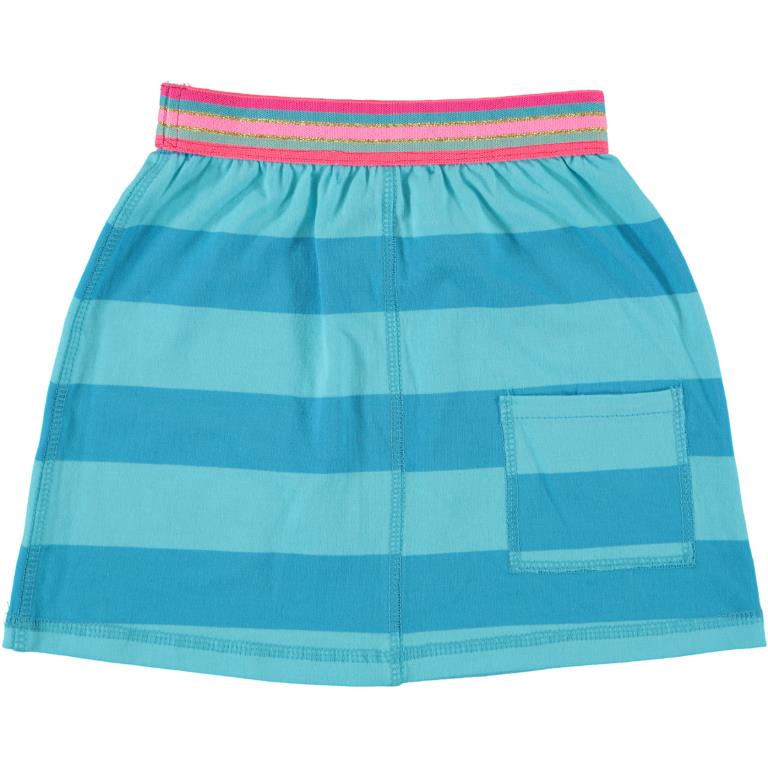 Witziger blau gestreifter, schmal fallender Rock von Mim-Pi. Die Tasche auf der Vorderseite wurde mit einer kupfernen Logo-Münze verziert. Den Bund bildet ein mit Goldfäden durchzogenes Multicolor-Elastikband.