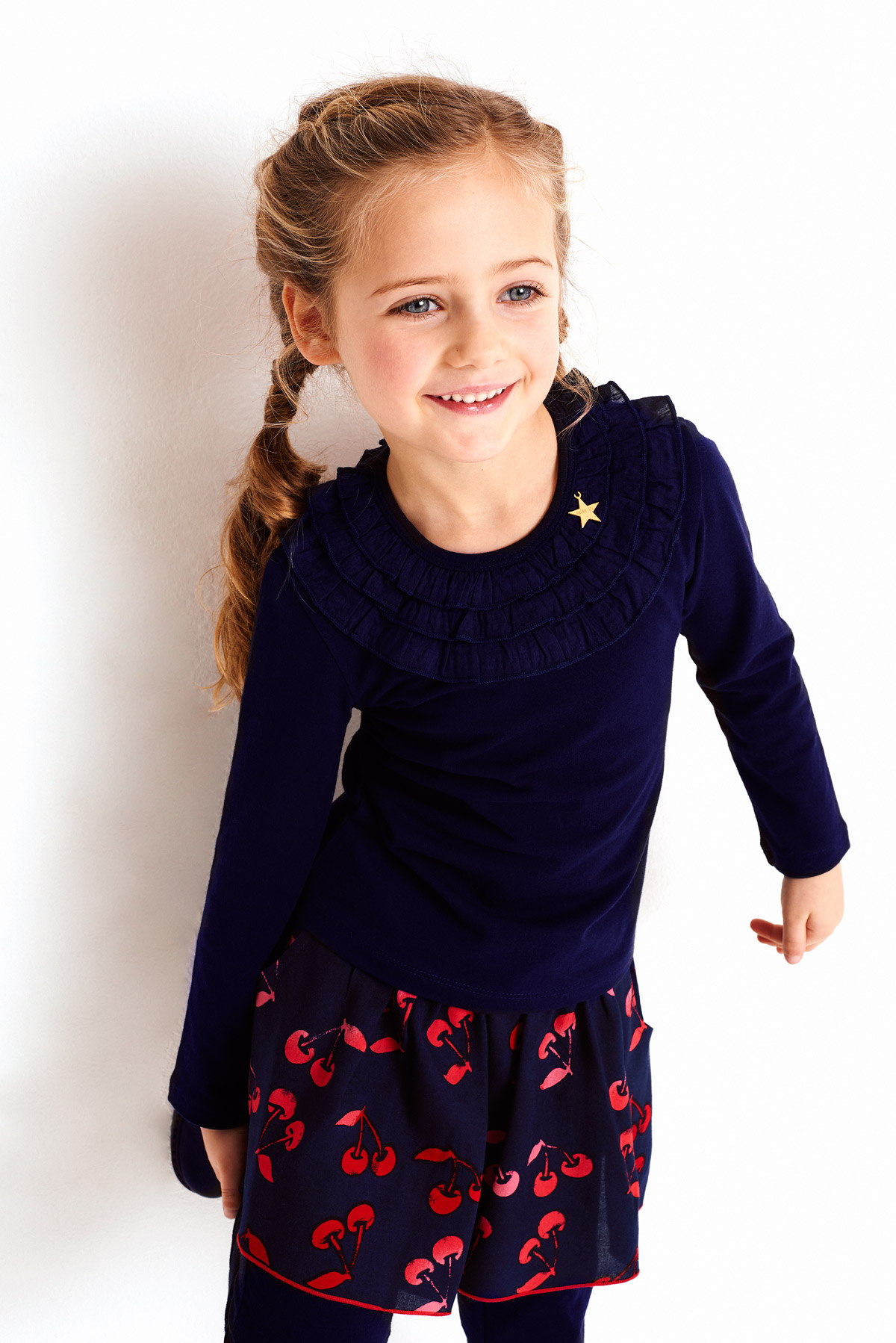 Zauberhaftes Langarm-Shirt von Mim-Pi in blau mit Volantsreihen am Halsausschnitt.