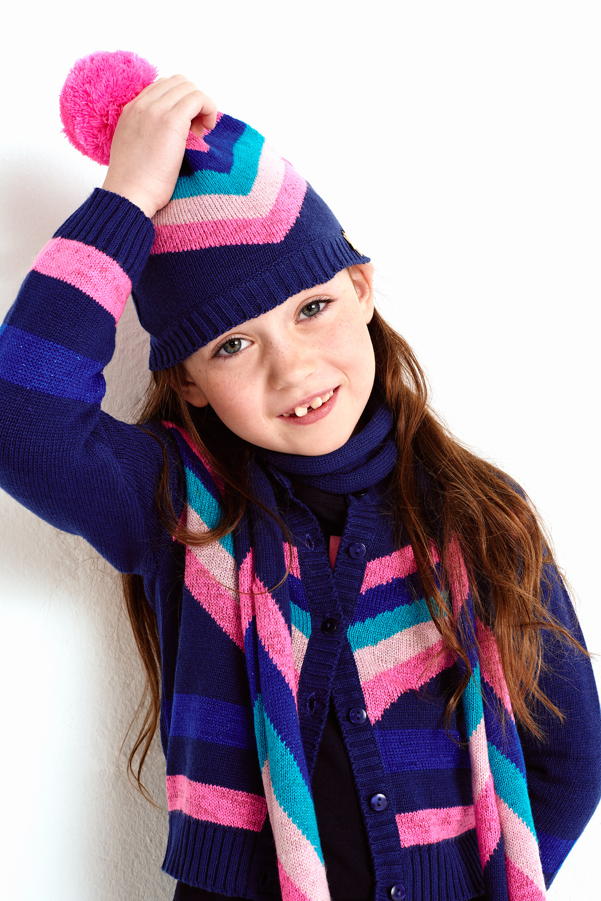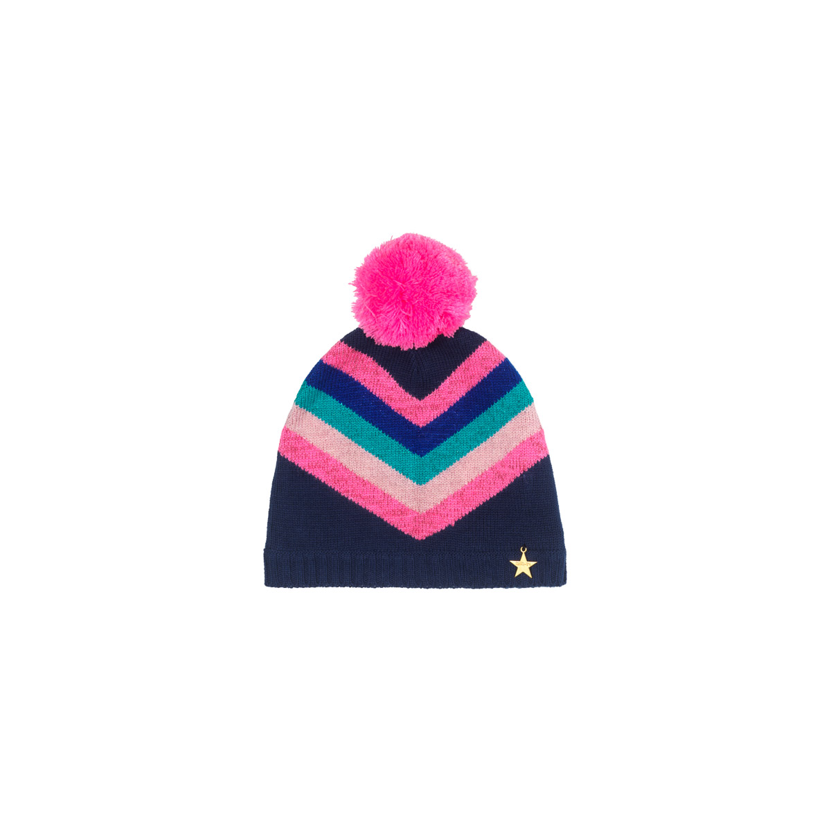 Strick-Mütze von Mim-Pi in blau mit Streifen-Muster und Bommel.