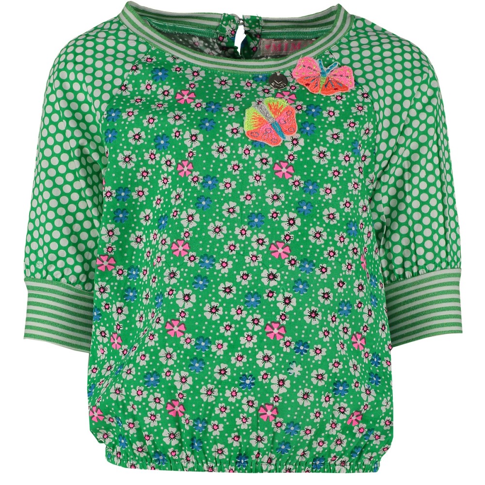 Zauberhaftes Blusen-Shirt von Mim-Pi in grün im Punkte- und Blumen-Look, mit schönen Schmetterlingspatches. Der leichte Gummizug am Bund sorgt für einen perfekten Sitz.