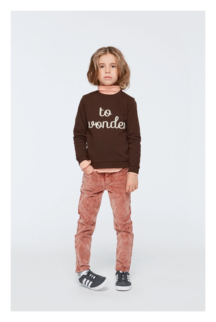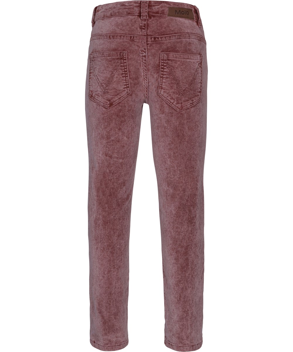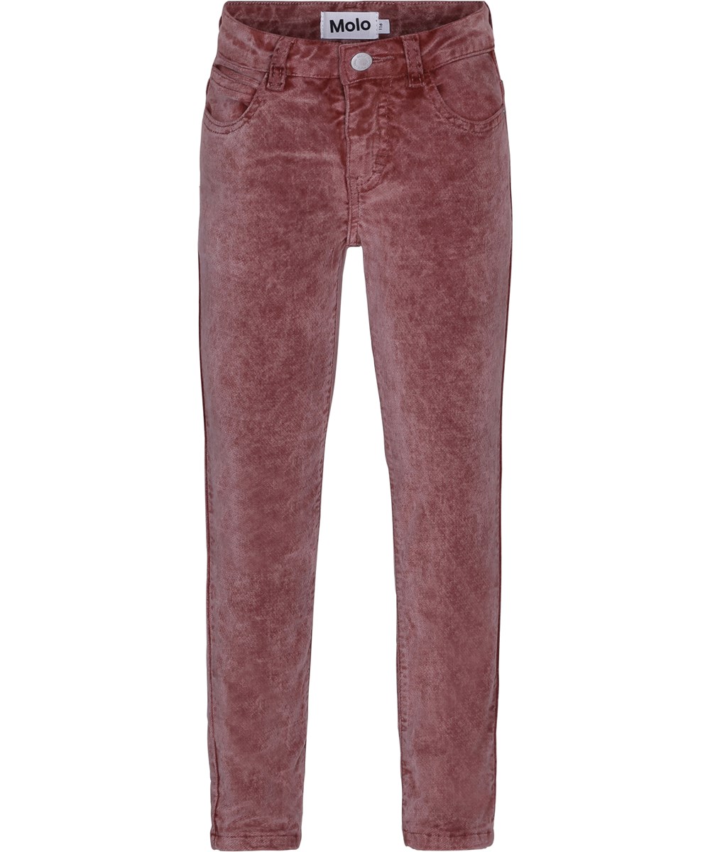 Slim fit Hose aus einem weichen Velours. Sie hat eine verstellbare Taille mit Knopf, Gürtelschlaufen, Front- und Gesäßtaschen, einen Reissverschluss mit Hakenknopf bis Gr. 128, ab Gr. 134 ein fester Knopf mit Knopfloch.
