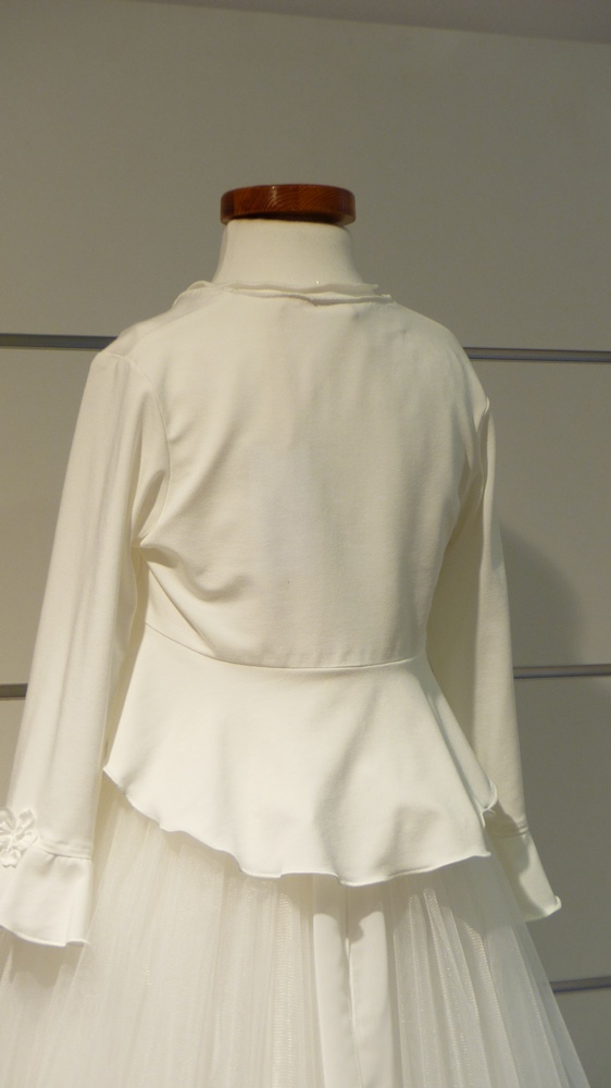Ein Bolero in absolut feiner Qualität. Wunderschöne Volantärmel, reizender dezenter Halsausschnitt. Mit Blüten-Knopf zum Schließen. Hinten mit Schößchen. Exklusives Design mit schönen kleinen Details aus knuffig weichem Jersey.