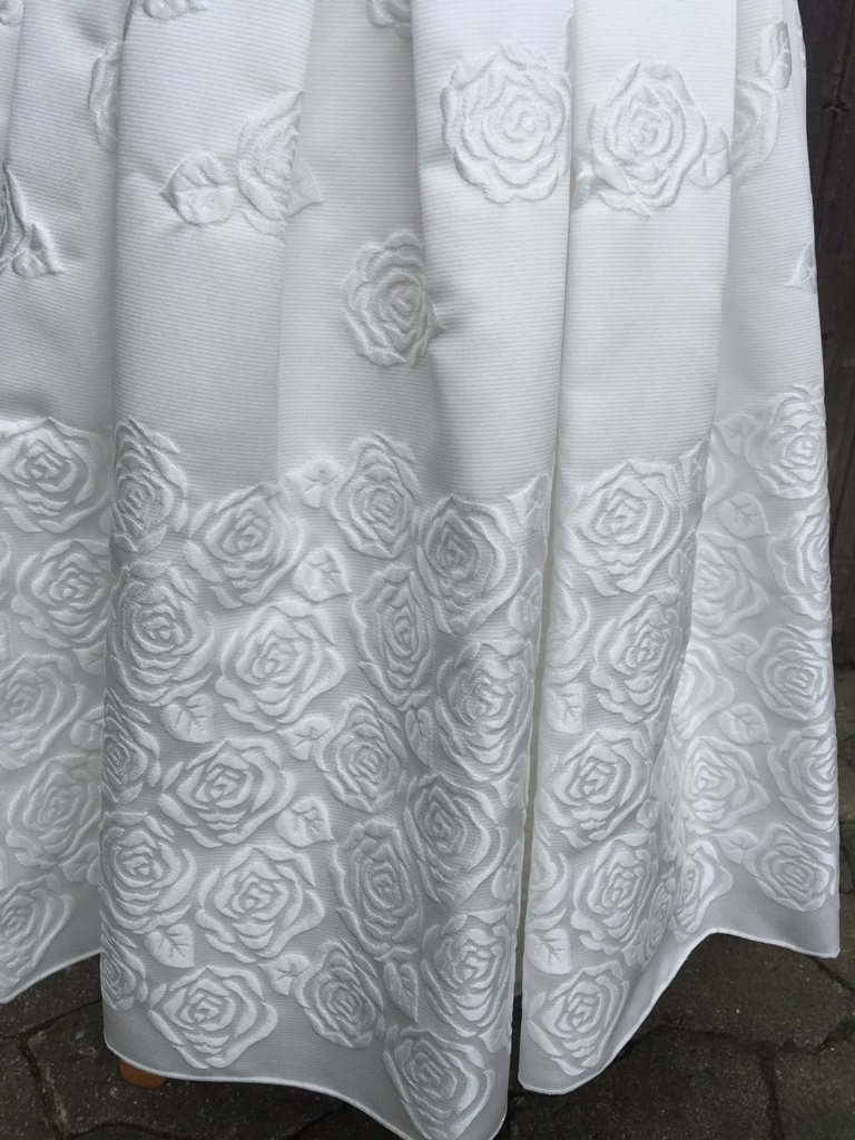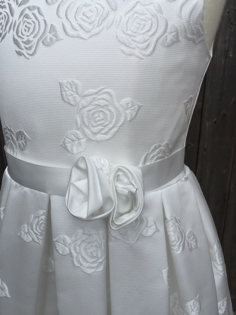 Exklusives Kleid mit vielen schönen Details aus Damast mit wundervollem Rosen-Muster, die Taille ziert ein Satinband mit Rosenblüte. Mit Reißverschluss am Rücken. Der Rockteil ist in Kellerfalten gelegt und ausgesprochen exklusiv doppellagig gearbeitet.