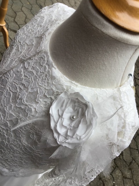 Bezauberndes Kleid mit vielen schönen Details. Das Oberteil ist aus Satin mit Spitzenstoff gearbeitet und das Rockteil ausgesprochen exklusiv aus fein fliesendem Crepe in zwei Stufen gearbeitet. Reißverschluss am Rücken mit schöner Schleife aus Baumwoll-Voile.