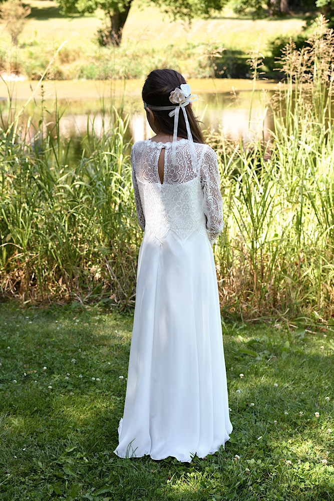 Zauberhaftes Kleid mit vielen schönen Details. Das Oberteil ist aus edler feiner weicher Spitze garbeitet. Das Kleid wird mit einem Reissverschluss im Rücken geschlossen. Das Rockteil ist exklusiv mehrlagig aus Crepe gearbeitet. Lange transparente Spitzenärmel mit edlem Armabschluss.