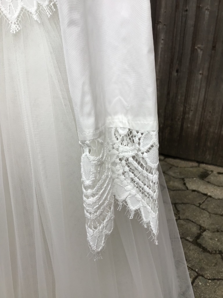 Zauberhaftes Kleid mit vielen schönen Details. Das Oberteil aus Satin ist mit einer exklusiven Spitze besetzt. Reißverschluss am Rücken mit einer schönen Schleife aus Baumwoll-Voile. Das Rockteil ist aus mehrlagigem feinsten Tüll mit Taftunterrock. Den passenden Bolero mit Ärmelabschlüsse sind aus der selben exklusiven Spitze wie das Oberteil können wir für Sie sehr gerne besorgen. Schreiben Sie uns an!