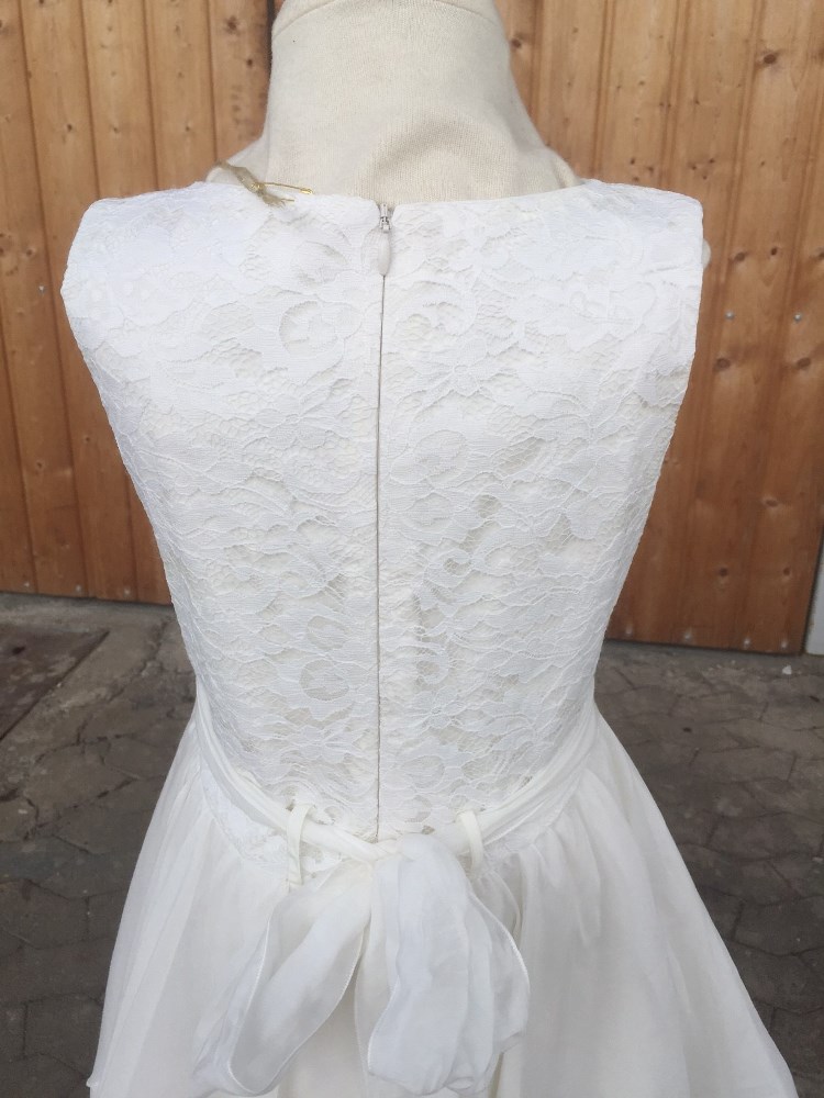 Schlichtes Kommunionkleid aus edlem Material mit enger geschnittenem Oberteil - edle Spitze unterleg mit Satin. Ein breiter Bindegürtel mit hübscher Blütenapplikation vorne. Ein Reißverschluss hinten. Der Rock ist mehrlagig gearbeitet, wobei im vorderen Bereich der Spitzenstoff sichtbar ist.