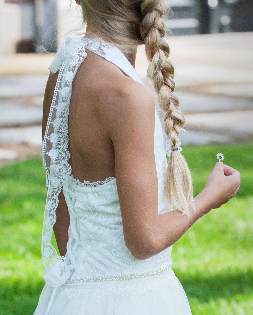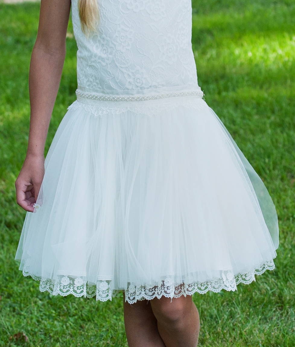 Traumhaftes weitschwindendes Neckholder-Kleidchen in ecru. Dieses raffinierte Neckholder Kleid hat eine tiefer angesetztes Rockteil. Das Oberteil ist mit schönster Spitze überzogen. Die Neckholder-Bänder sind aus schönster Spitze. Der ist aus mehrlagigem feinem Tüll gearbeitet. Der Saumabschluss wird von einer schönen Spitze verziert. Das aufwändige Perlen- und Spitzenband verläuft im Rücken zu einer schönen Schlaufe. Geschlossen wird das Kleid mit einem Reissverschluss geschlossen, am Rücken mit wunderbarer Schnürung zur Weitenregulierung.