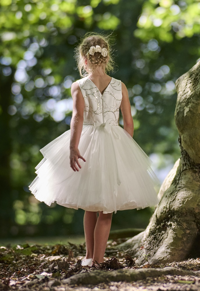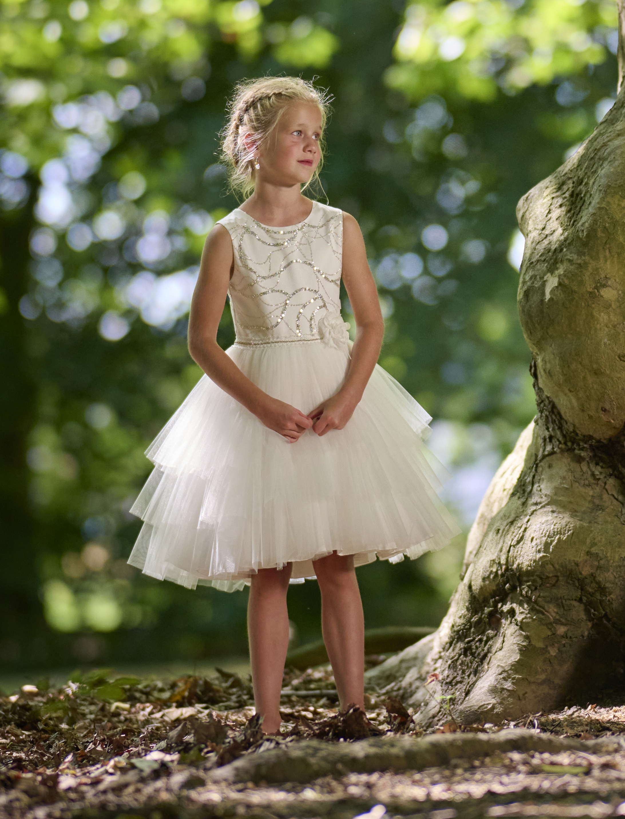 Zauberhaftes Kleid mit vielen schönen Details. Das Oberteil ist aus edlem Tüll doppellagig mit Glitzer und Pailletten in Gold gearbeitet. Das Kleid wird mit einem Reissverschluss im Rücken geschlossen. Die Taille ziert ein Glitzerband und am wird eine Schleife gebunden. Das Rockteil ist exklusiv mehrlagig und stufig aus Tüll und Satin mit einem Baumwollunterrock gearbeitet.