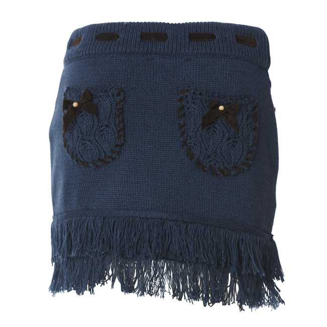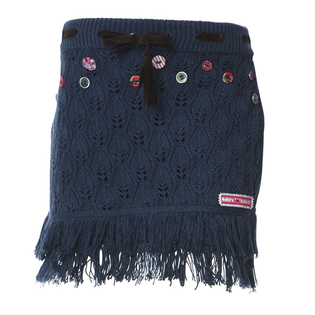 Wahnsinns Strick-Rock von Muy Malo in orion blue, am Bund mit einem schönen Band regulierbar, vorne am Bund mit bunten Knöpfen verziert, am Saum mit zwei Fransenreihen, auf der Rückseite schmücken zwei wunderschöne Popo-Taschen mit Schleifchen den Rock. Der Hammer!