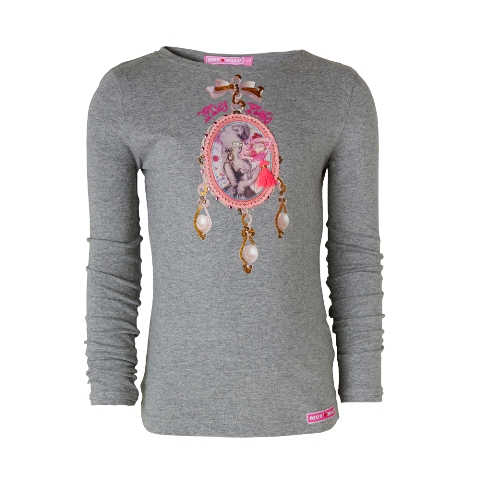 Wundervolles Langarm-Shirt/Longsleeve von Muy Malo mit Front-Print in 3D-Optik - Bordüren, Print, Pailletten, Strass - so wie für Muy Malo typische Details. Der Rücken ist grey melange.
