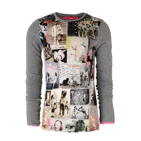 Super Langarm-Shirt/Longsleeve von Muy Malo mit großem Photo-Front-Print, verziert mit Pailletten, Nieten - so wie für Muy Malo typische kleine Details. Der Rücken ist grey melange.