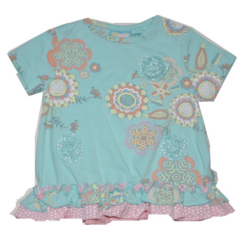 Wunderschönes T-Shirt von Paglie Mini mit großem Blumen-Print und Applikation, am Bund mit Muster-Mix Rüschenreihen. An der Schulter mit zwei Druckknöpfen.