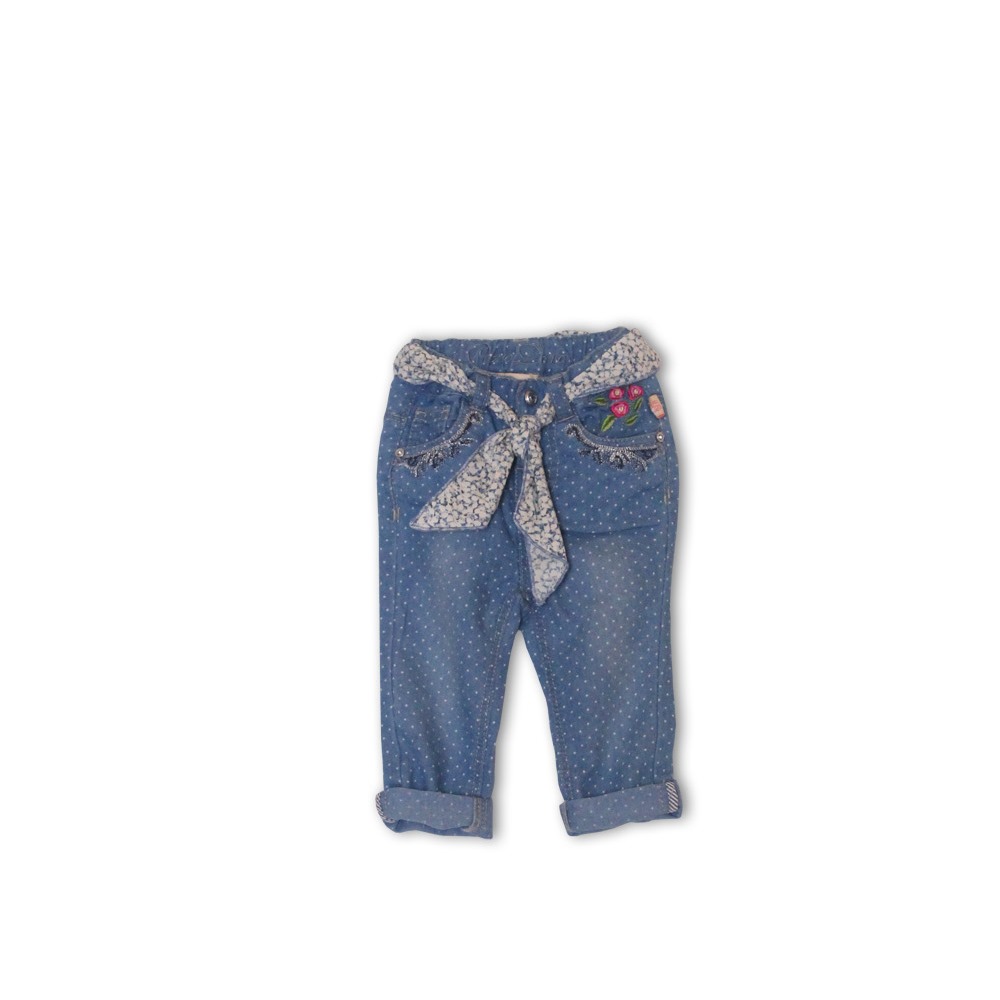 Superschöne Jeans-Hose von Pezzo D´oro in denim blue mit Pünktchen/Dots allover, superschöne Stickereien, 5-Pocket-Style, am Bund mit Schiebeknopf, Bund innen weitenverstellbar. Mit schönem Bindegürtel!