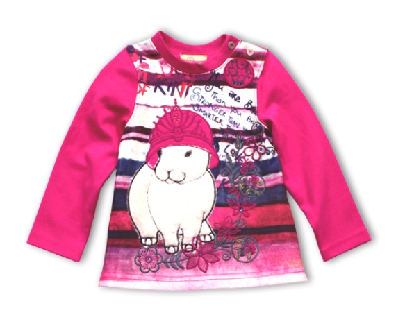 Traumhaftes Langarmshirt/Longsleeve von Pezzo D´oro im Streifen-Look, vorne mit Streifen-Print und Häschen-Applikation Strasssteinchen und Stickereien, der Rücken im pink-blauen Streifen-Look, die Ärmel sind unifarben. An der Schulter mit Druckknöpfen.