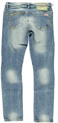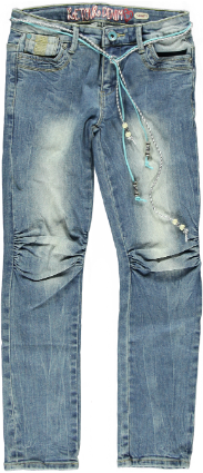Super Coole Retour Jeans, Celia, in denim, Slim fit, mit toller Waschung, Bund innen verstellbar, zwei Taschen vorne, zwei super Popotaschen, mit Retour-Knopf und Reissverschluss, lässigem silber-aquafarbene Bindegürtel, die gerafften Knie machen die Hose zu einem richtigen Hit, super bequem.