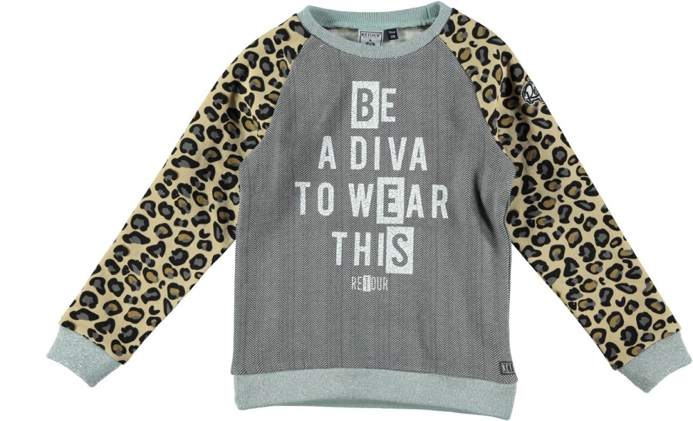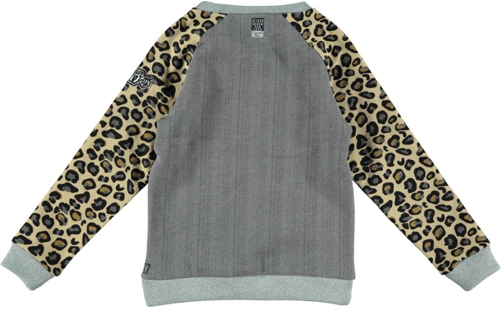 Exklusives Sweat-Shirt von RETOUR mit Leoparden-Ärmeln und Fischgätenmuster Front und Rücken inklusive passenden glitzernden Bündchen.