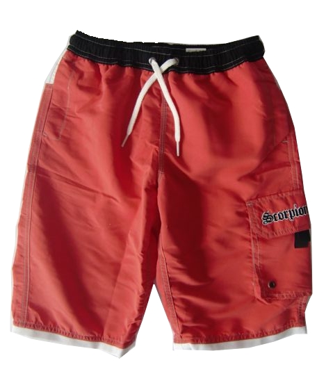 Klasse Scorpion Badebermuda im Sportswear-Look in rot-weiss-schwarz, mit Seiten-Klappentasche, zwei Eingriffstaschen. Wenn der Stoff der Hose nass wird erscheint ein zusätzlicher Scorpion auf dem Stoff. Trocknet der Stoff, verschwindet das Muster wieder. Mit Kordel, Innenslip.