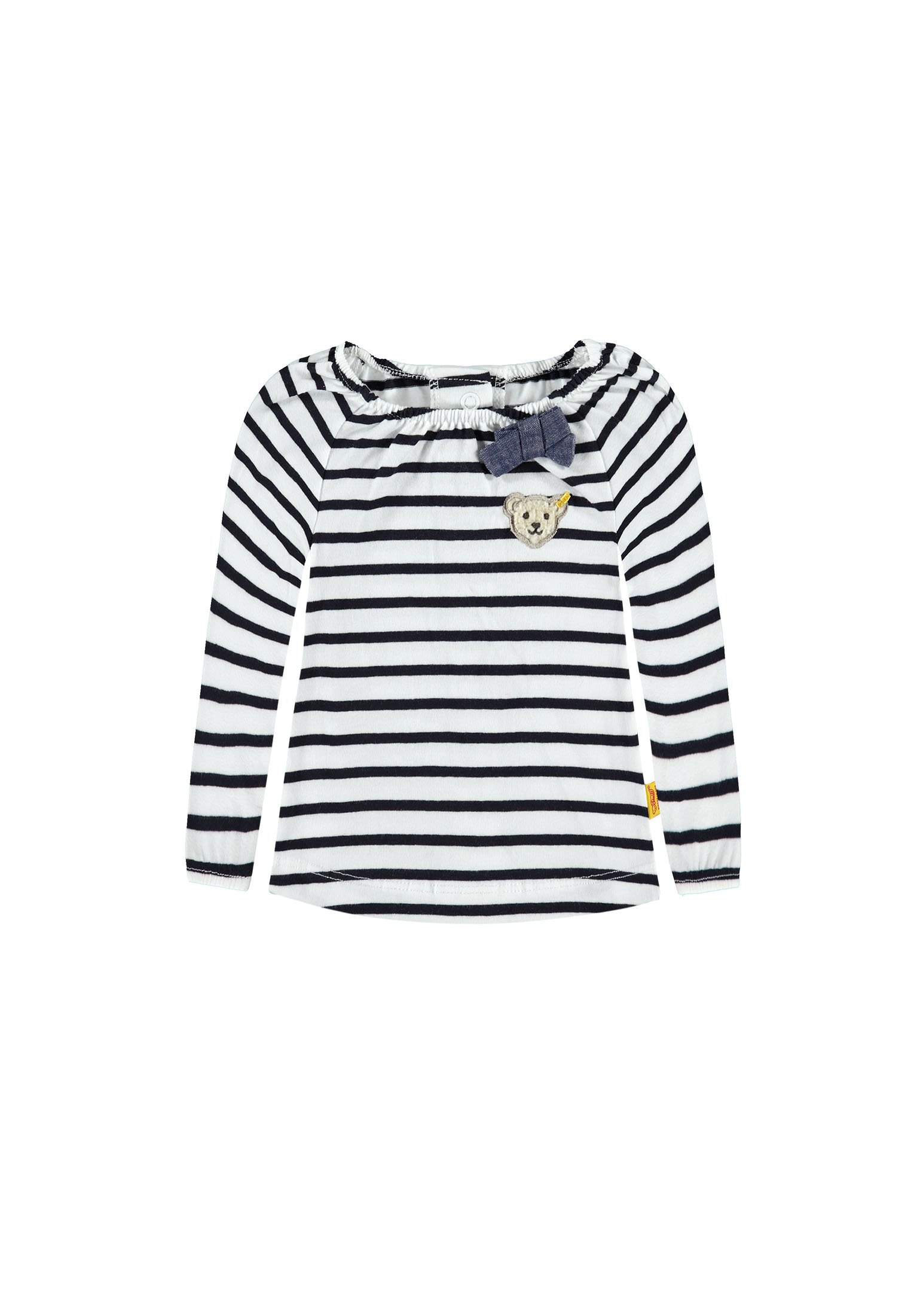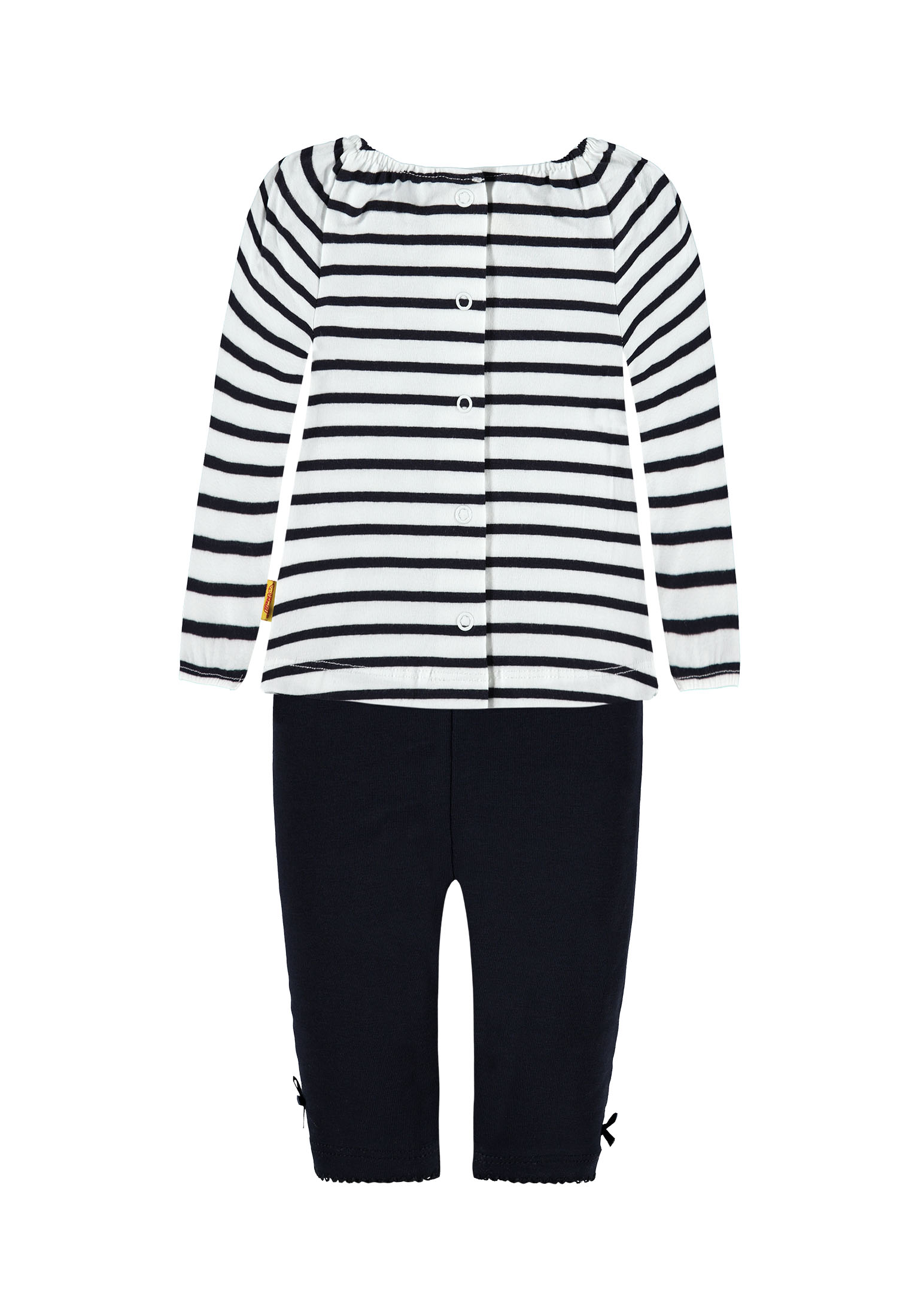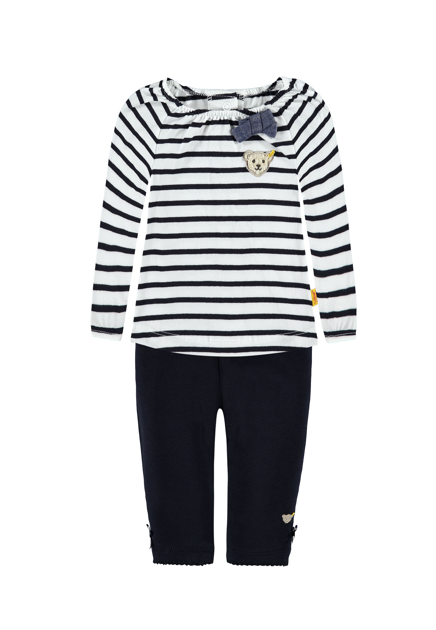 Super süßes Set von Steiff für die allerkleinsten Mädels bestehend aus einem Langarmshirt im Streifen-Look marine-weiss mit aufgenähter Schleife und dem kuscheligen Steiff-Bären auf der linken Brust. Das Shirt ist im Rücken mit Druckknöpfen zum Schließen. Die Legging ist mit Wohlfühlbund - hier drückt nichts - und herzigsten Details wie Mäusezähnchen Saumabschluss, dem gestickten Steiffbären am linken Bein verziert mit einer kleinen Schleife.