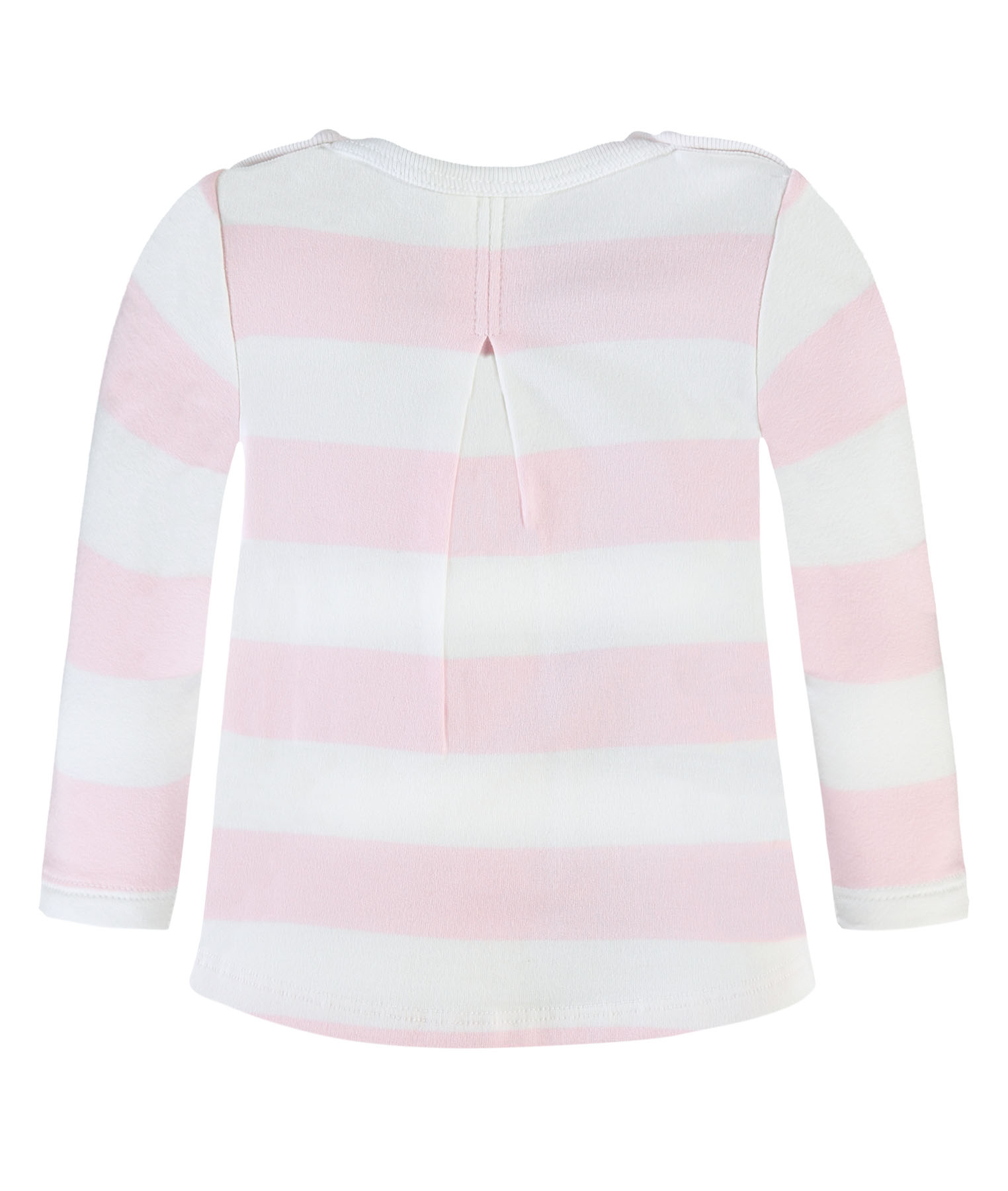 Supersüßes Sweatshirt für die kleinsten Mädchen von Steiff im Streifenlook und großer Teddykopf- Applikation auf der Front, am Rücken mit einer sehr schön gesetzten Kellerfalte, hinten etwas länger geschnitten als vorne, leichte A-Form. Schulterknöpfe erleichtern das An- und Ausziehen.
