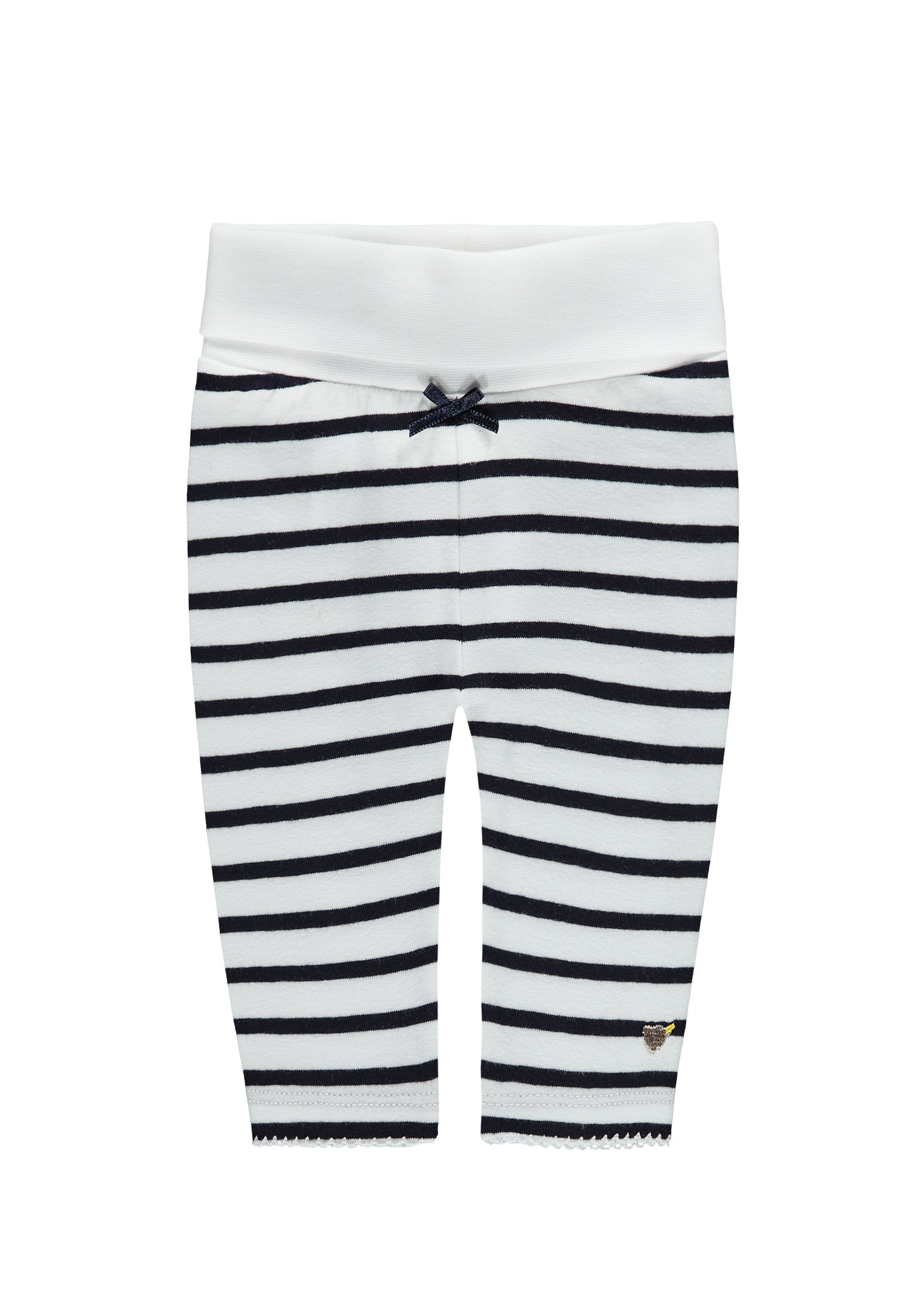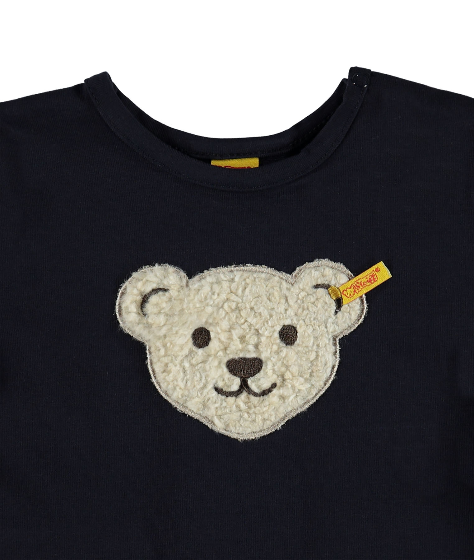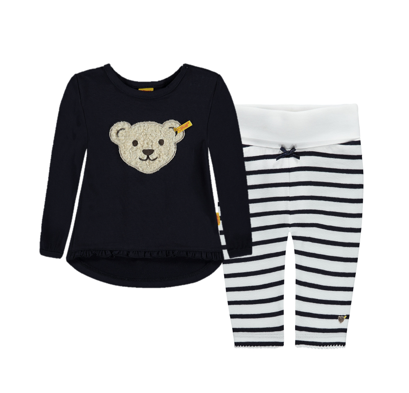 Super süßes Set von Steiff für die allerkleinsten Mädels bestehend aus einem Langarmshirt uni in marineblau mit dem kuscheligen Steiff-Bären auf der Front mit dezenter Rüsche am Bund und am Rücken mit einer sehr schönen Kellerfalte. Das Shirt ist an der linken Schulter mit Druckknöpfen zum schließen. Die Legging ist im Streifenlook mit Wohlfühlbund - hier drückt nichts - und herzigsten Details wie Mäusezähnchen Saumabschluss, dem gestickten Steiffbären am linken Bein.
