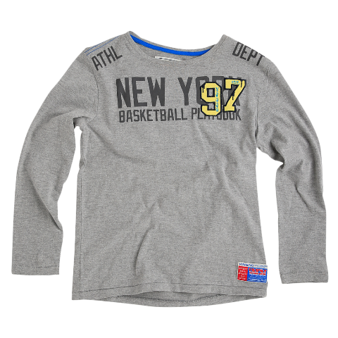 Cooles Langarm-Shirt/Longsleeve von Vingino in grau mele mit großem Front-Print und Zahlen Patch, am Rücken auch mit großem Patch und mit Print - super angenehm zu tragen.
