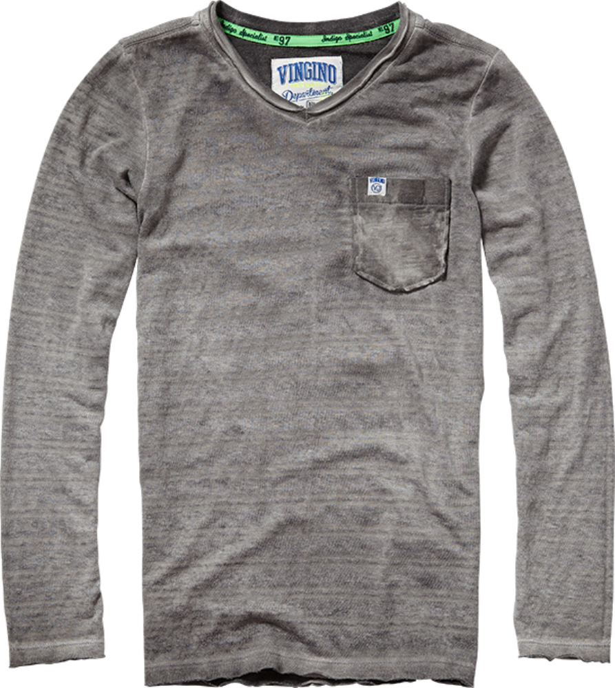 Schönes Langarm-Shirt/Longsleeve von Vingino im Basic Style, grau, V-Ausschnitt, mit Brusttasche, mit Rücken-Schrift-Print, offene Kanten, mit Kontrastnähten - tolle Web-Optik.