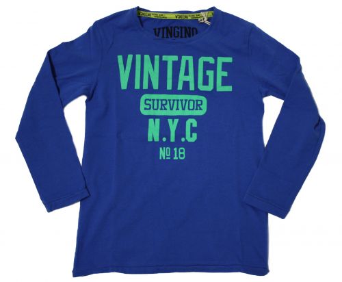 Cooles Langarm-Shirt von Vingino in med blue mit grünem "VINTAGE" Front-Print.