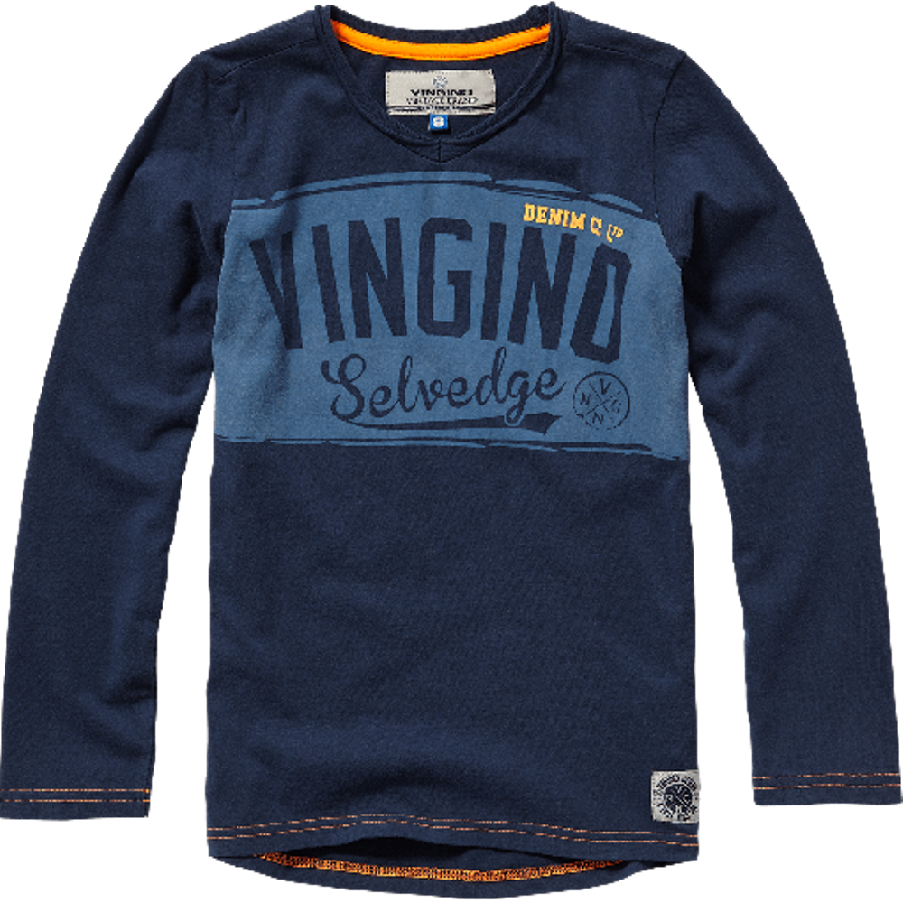 Attraktives Langarm-Shirt/Longsleeve von Vingino in dunkelblau mit Print, V-Ausschnitt, offenen Kanten und Kontrastnähten.