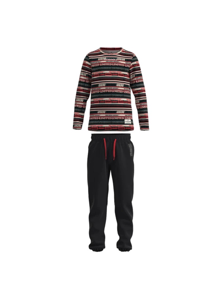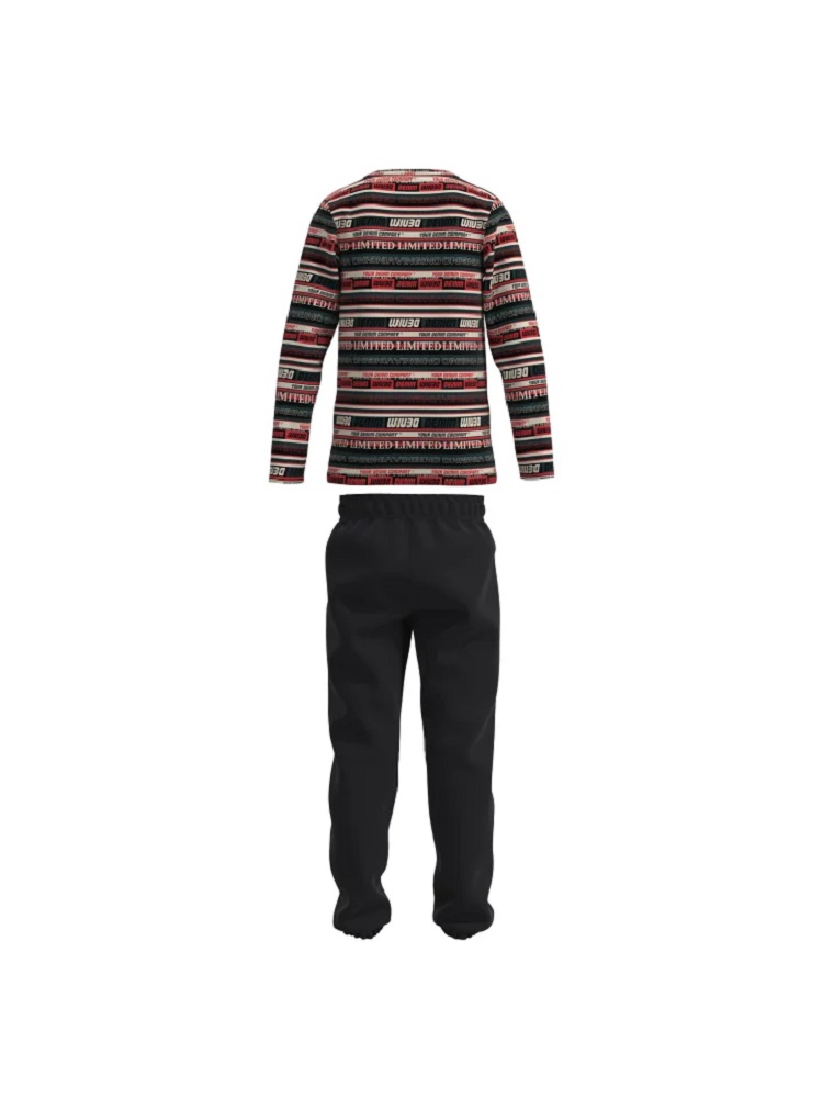 Sleepwear / Schlafanzug / Pyjama von Vingino. Supercool - den möchte man den ganzen Tag tragen. Das Oberteil ist ein Langarm-Shirt mit Muster, die lange Hose ist schwarz.