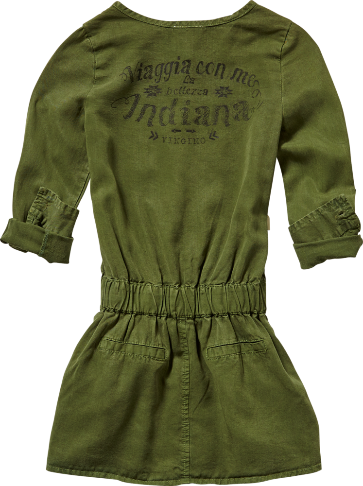 Hippes Langarm-Kleid von Vingino in dark army, kurz geschnitten, krempelbare und fixierbare Ärmel, vorne mit verdeckter Knopfleiste, Gummizug in Taille, Brust- und-Rücken-Print, zwei Eingrifftaschen vorne am Rockteil und zwei Fake Eingrifftaschen am Popo.