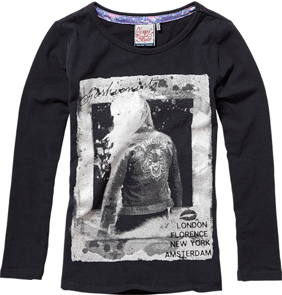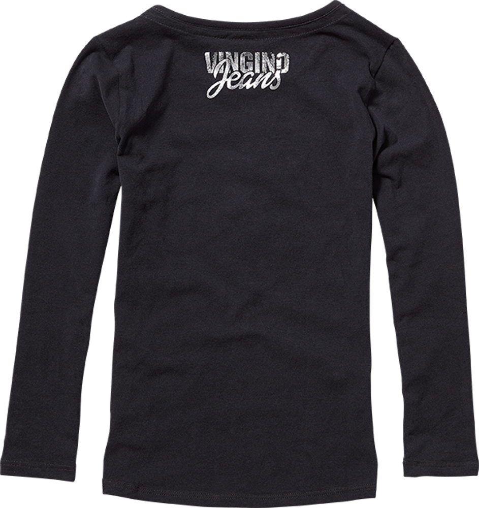 Cooles Langarm-Shirt / Longsleeve von Vingino in schwarz mit großem silbernen Foto-Print vorne, hinten mit silbernem Nacken-Logo-Print.