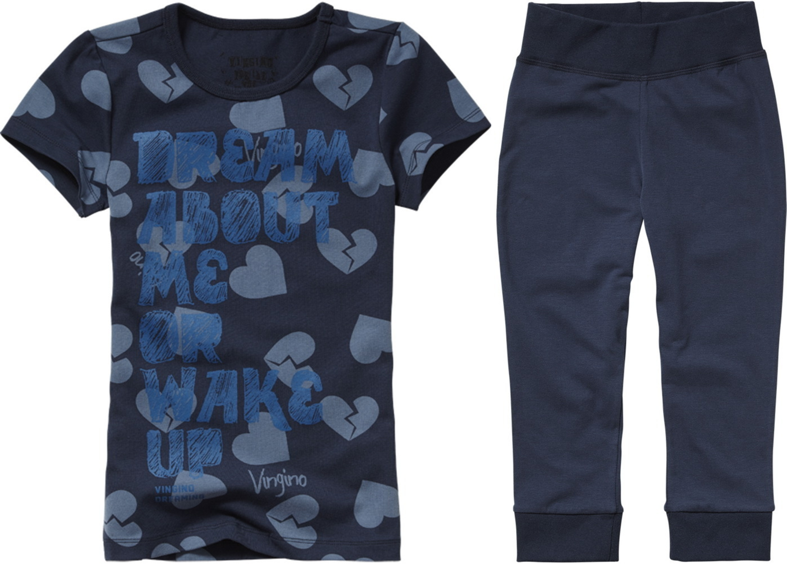 Sleepwear / Schlafanzug / Pyjama von Vingino. Das Oberteil ist ein schönes T-Shirt mit Herzen allover und Front-Schrift-Print, die 3/4-Hose ist uni, hat einen weichen breiten Bund an der Taille und an den Beinenden.