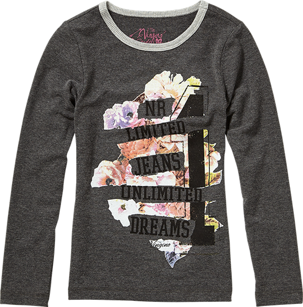Sleepwear / Schlafanzug / Pyjama von Vingino. Das Oberteil ist ein Langarmshirt in grau mit Front-Print, die lange Hose ist mit Flower-Print allover, lässig mit Gummibund und Logo-Schriftzug.