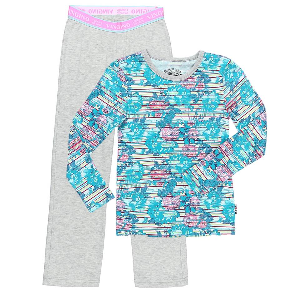 Sleepwear / Schlafanzug / Pyjama von Vingino. Das Oberteil ist ein schönes Langarmshirt mit Streifen und Blumen allover, die lange Hose ist uni in grau, Gummizugbund und Logo-Schriftzug.
