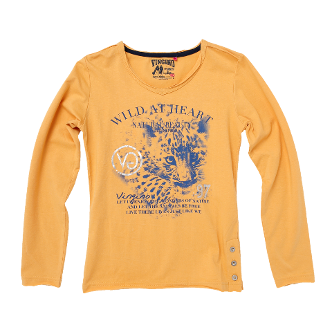 Cooles Langarm-Shirt von Vingino in einem schönen gelbton mit V-Ausschnitt, großem Front-Print und links mit seitlicher Knopfleiste - 3 Knöpfe.