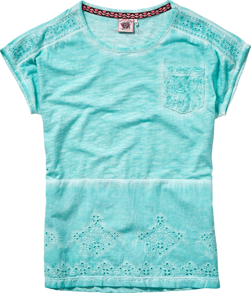 Tolles T-Shirt von Vingino in aruba blue im Batik-Look, Vintage-Style. Das Vorderteil ist mit tollen Details und schönen Spitzen/Lochmuster Details ausgestattet.