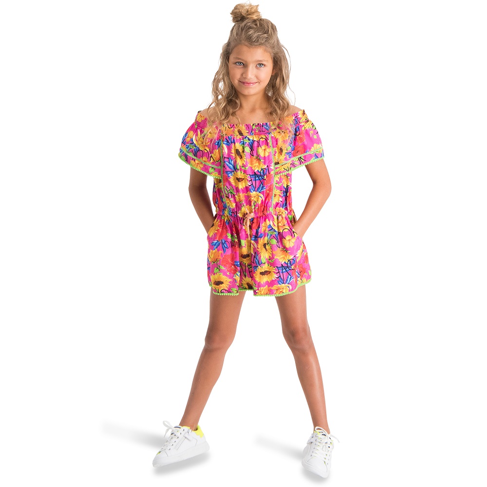 Setze mit diesem unwiderstehlichen trägerlosen Jumpsuit von Vingino auf einen unverwechselbaren Sommerlook, mit dem du garantiert alle Blicke auf dich ziehst. Der graffitiartige Schriftzug verleiht dem fröhlichen Blumenmuster eine coole Note. Die farbigen Nähte sind ein echter Hingucker! Das luftige Viskosematerial und der elastische Bund mit Kordel garantieren optimalen Tragekomfort.