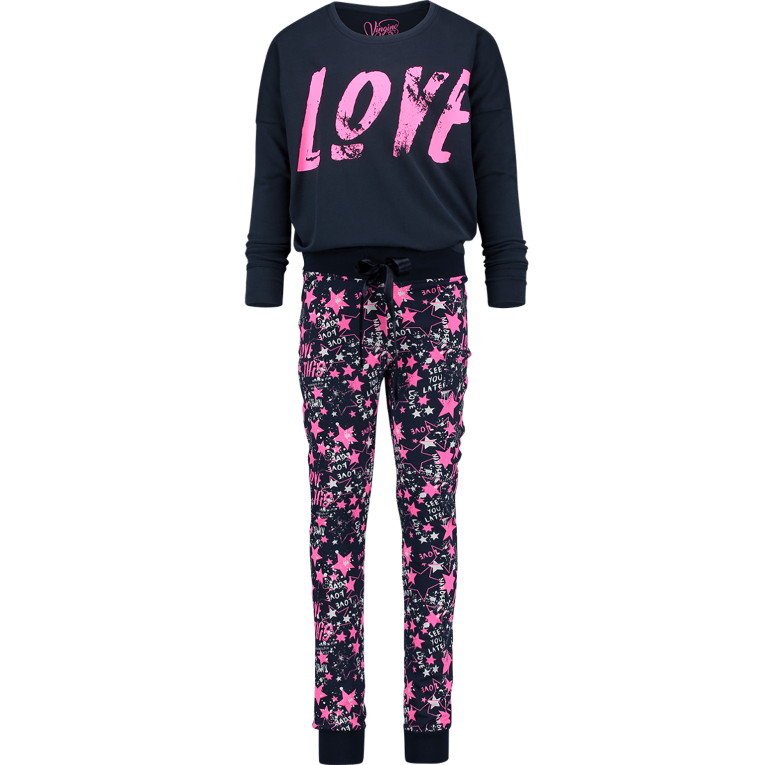 Sleepwear / Schlafanzug / Pyjama von Vingino. Das Oberteil ist ein schönes Langarmschirt-Shirt in dunkelblau mit Schrift-Print, die Hose ist mit Muster und hat einen Gummizugbund/Tunnelzug an der Taille.