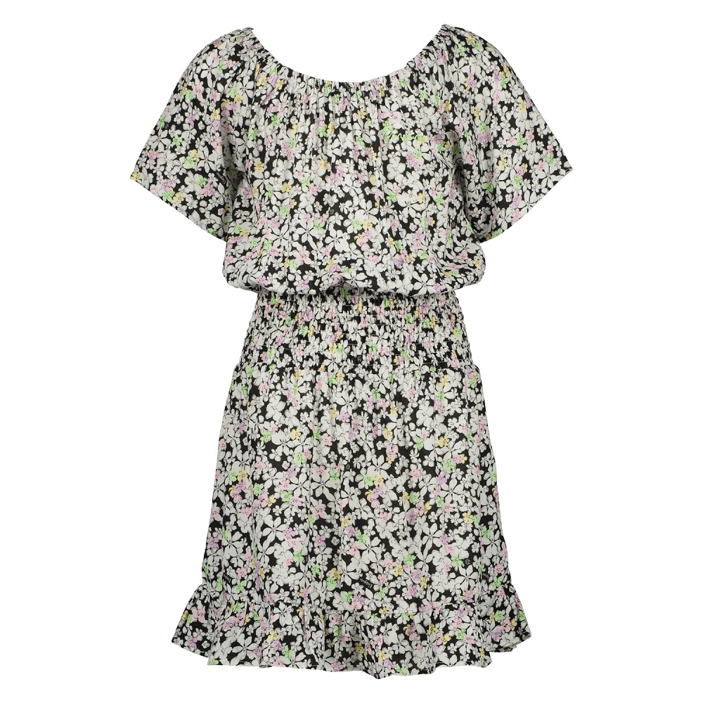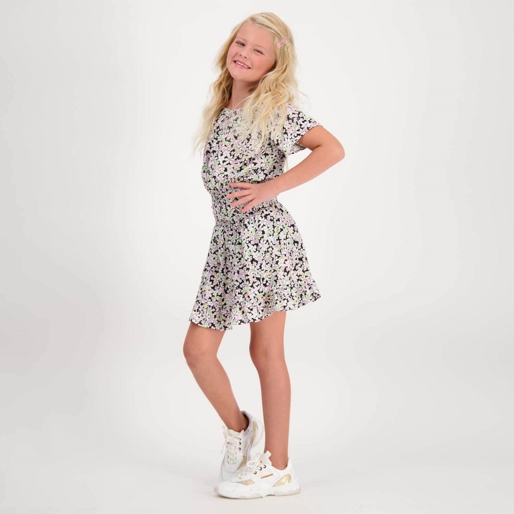 Superschönes Kurzarm-Kleid von Vingino mit elstischem Taillenbund und schwingendem in Stufen gelegten Rockteil mit Blümchen Muster.