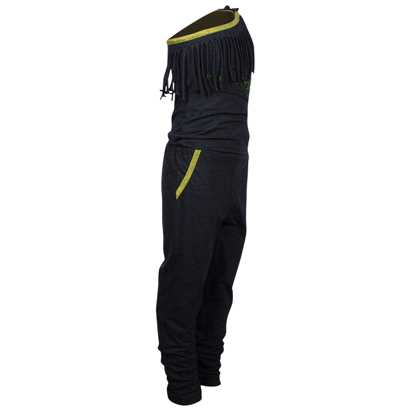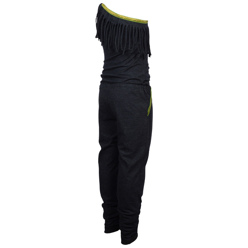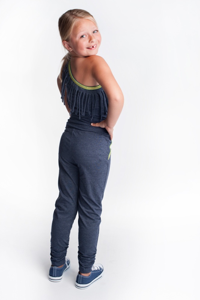 Herrlicher Jumpsuit von Kiezel-tje in jeansblau mit gesmokter Gummizug-Taille und zwei mit glitzer-Bordure verzierten Einschubtaschen vorne. Superhighlight ist das asymmetrisch geschnittene Oberteil gehalten von einer Schulter mit tollen Fransen.
