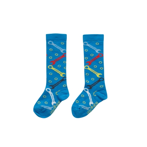 Frecher Kniestrumpf von LEGO WEAR mittelblau mit eingewebtem Werkzeug-Muster,